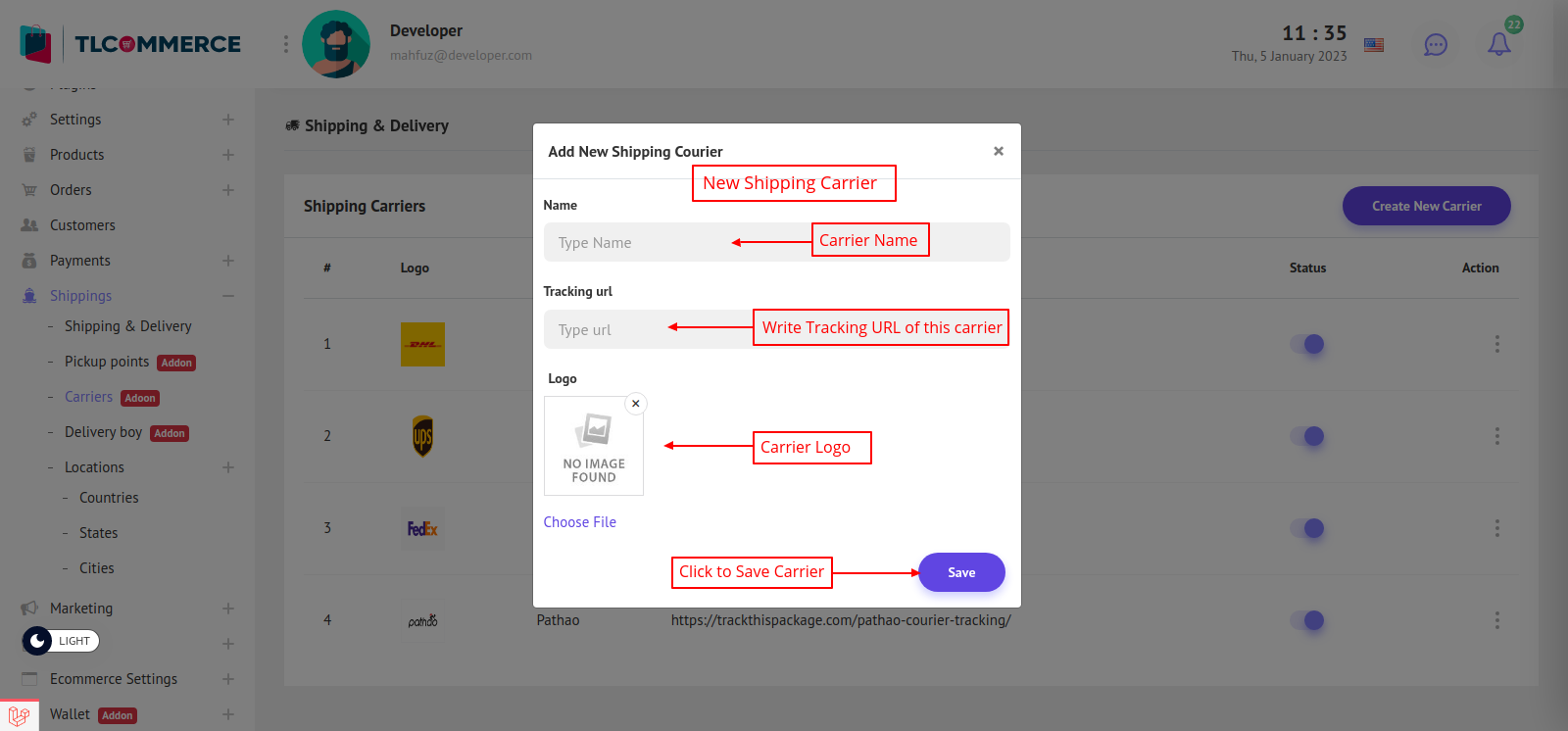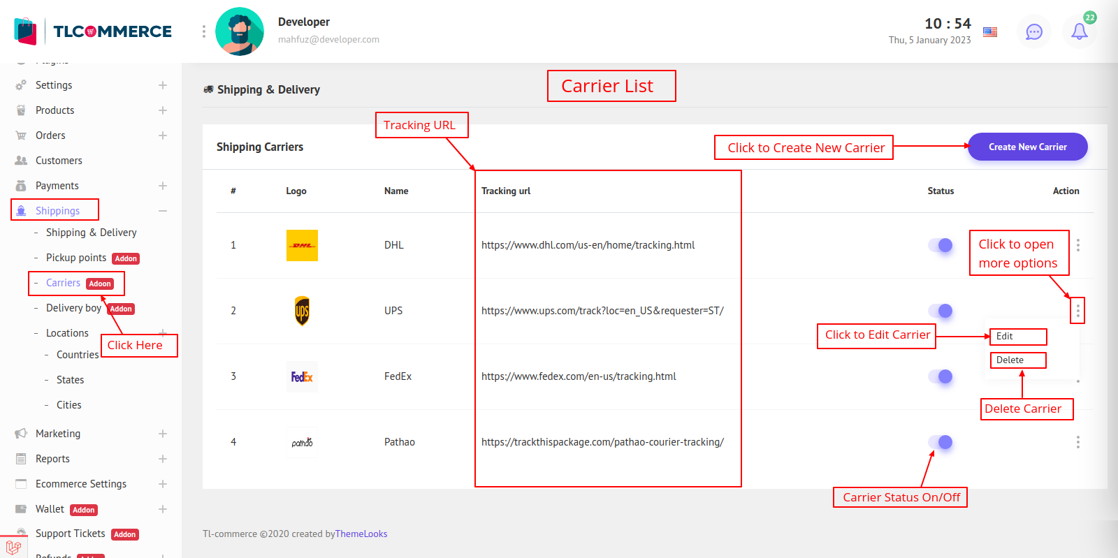 To create new carrier click Create New Carrier. It will open a model. Fill the field and also Add Tracking URL of the carrier websites.
