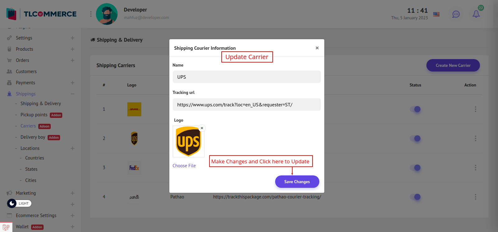 To edit a carrier click Edit from carrier list.It will open a model .Here you can make changes and update carrier. And to delete a carrier click Delete from carrier list.