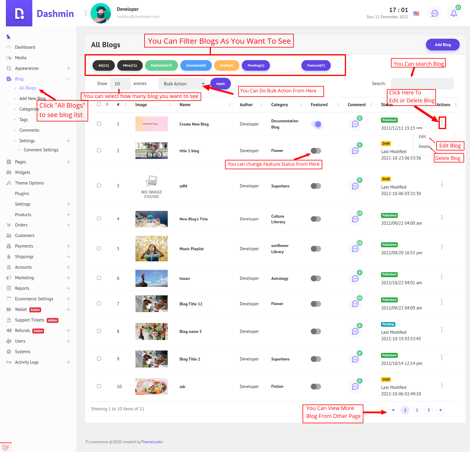 Follow Blogs > All Blogs to see the blog list page. Here you can filter blogs, manage status, edit blogs, delete blogs, and also can create blogs.