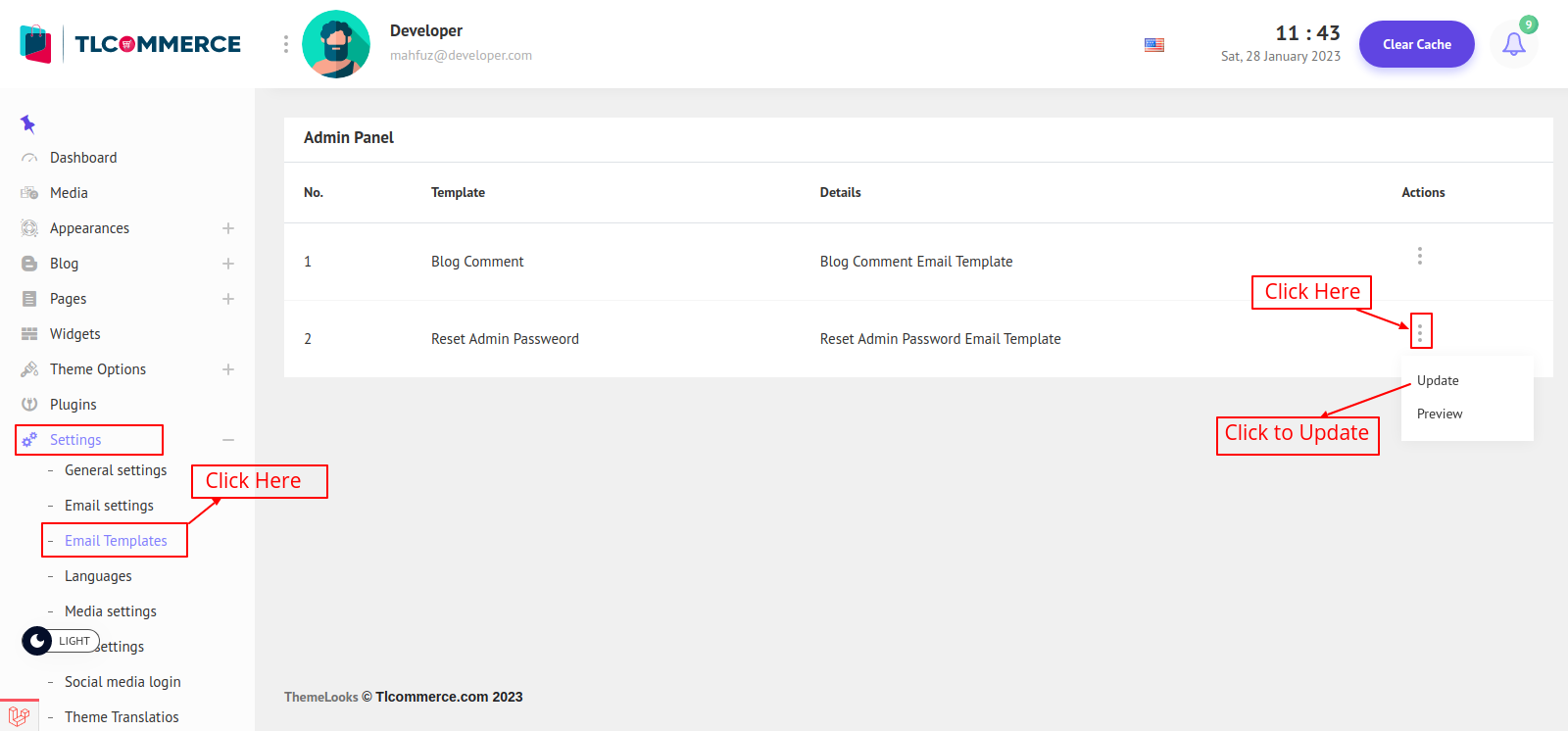 Now to update an email template click the three dots(.)and then click Update. A Modal will appear.