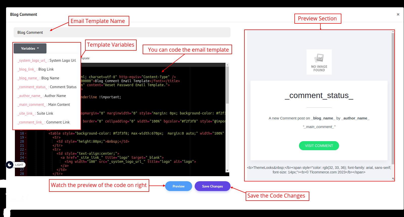 As you can see in the below image, the modal is divided into two sections. The left side is a Code Editor, where the template code is written. And the right side is a Preview box where you can see the preview for that code. Make changes to the code and click Preview to view the update.