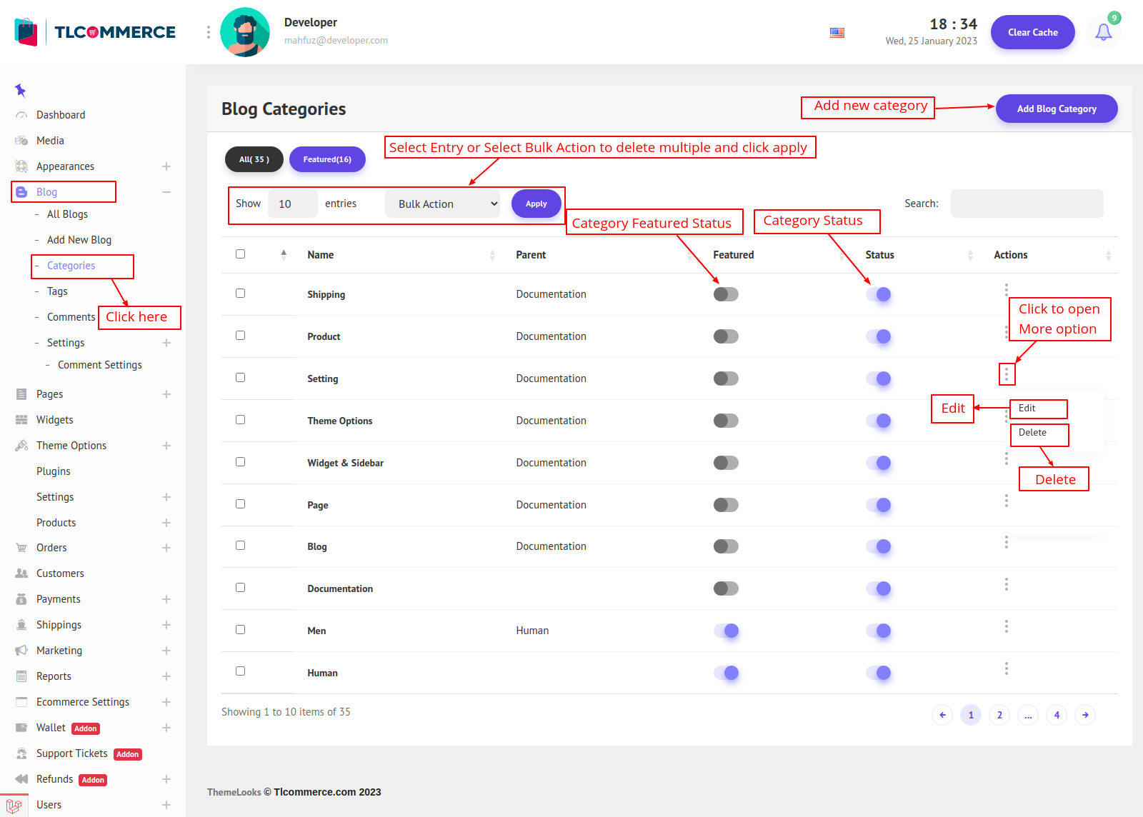 In this post, we will learn how to manage Blog Categories. Follow Blogs > Categories and you will be redirected to the category list page. Here you can find all the available categories, you can search and find, filter, manage, delete and create new ones.