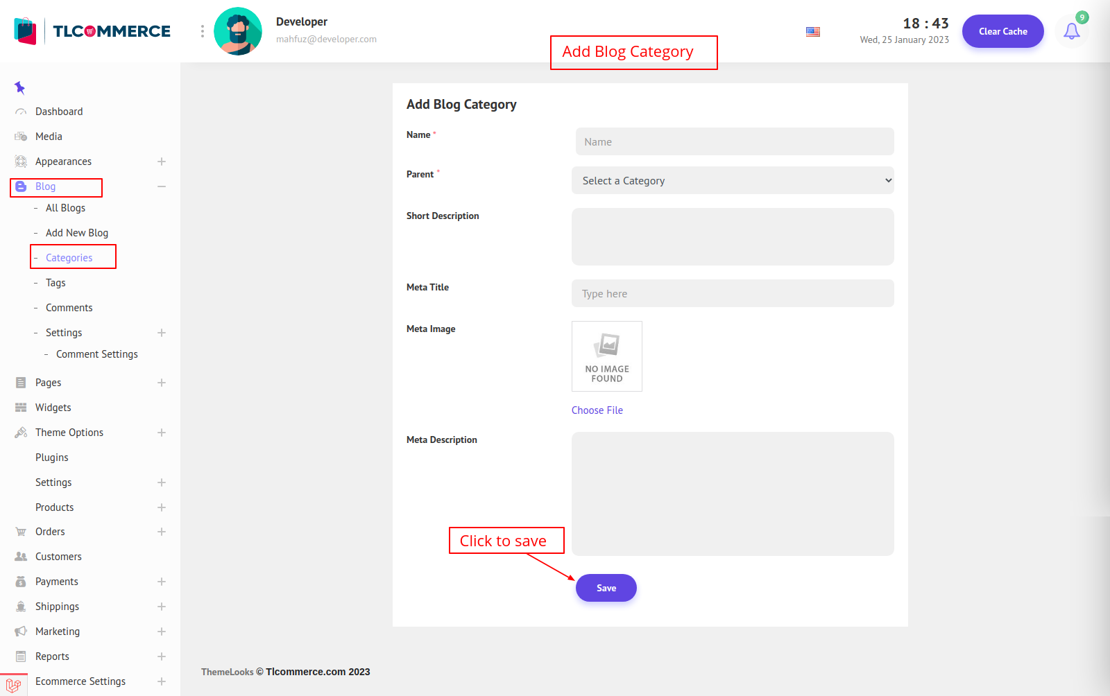 To create a new category click Add Blog Category button and you will be redirected to another page. Here you can give a name and edit the permalink, select a parent, and set SEO information.