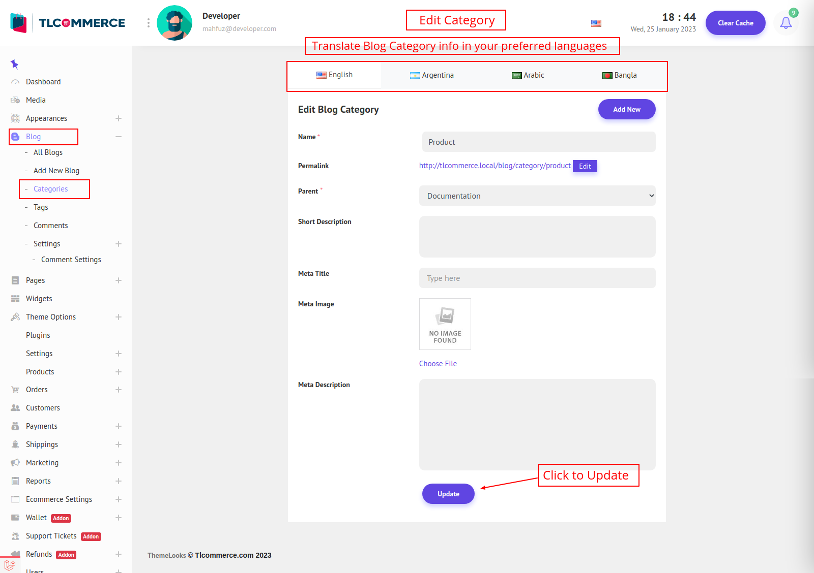 To Edit a Category click Edit from the list page and you will be redirected edit page. Here you can translate category info into another language also. To Delete a category click Delete.