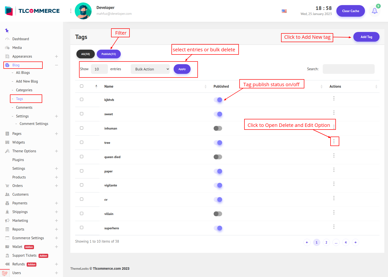 In this post, we will learn how to manage Blog Tags. Follow Blogs > Tags and you will be redirected to the tag list page. Here you can find all the available tags, you can search and find, filter, manage, delete and create new ones.