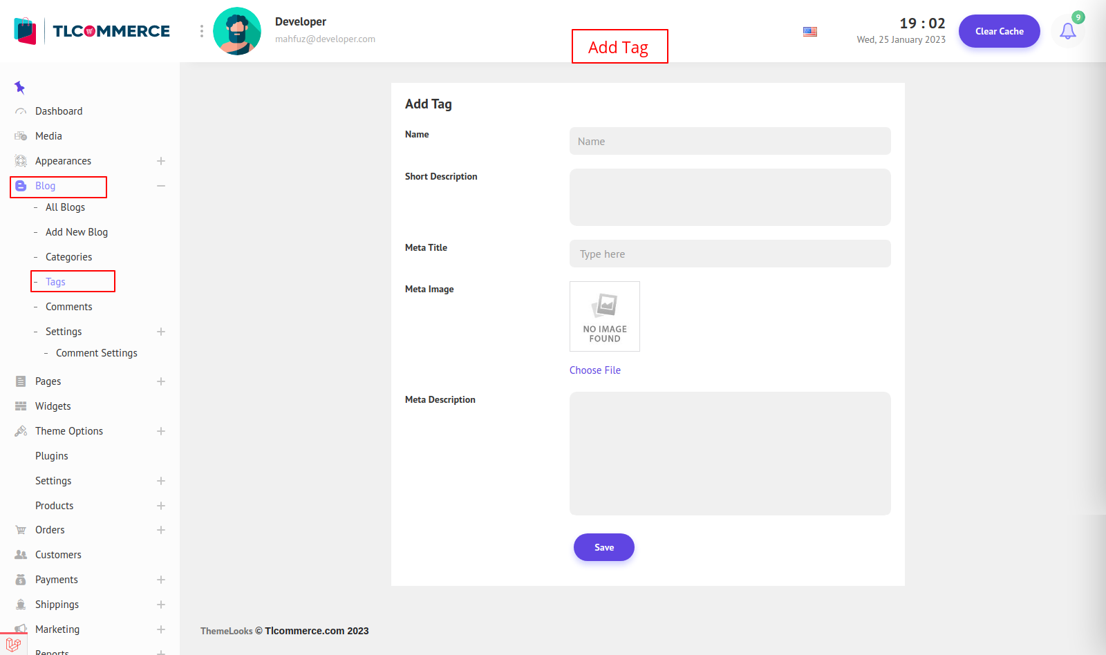 To create a new tag click Add Blog Tag button and you will be redirected to another page. Here you can give a name and edit the permalink and set SEO information.