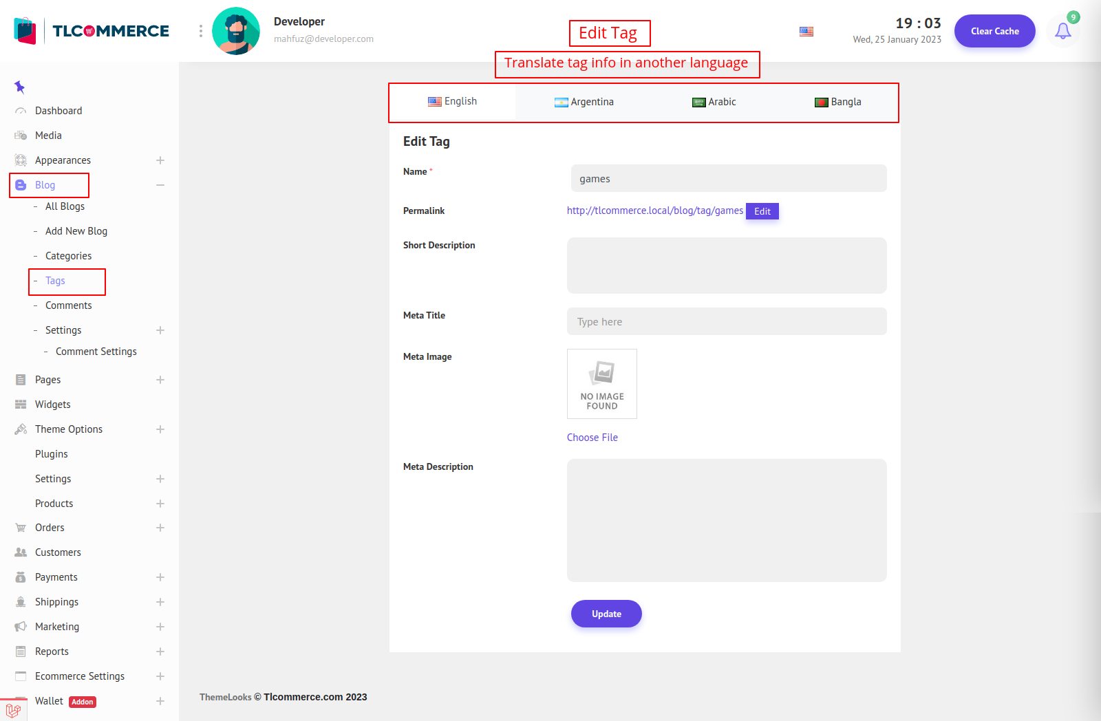 To Edit a tag click the Edit link from the list page and you will be redirected edit page. Here you can translate tag info into another language also. To Delete a tag click Delete.