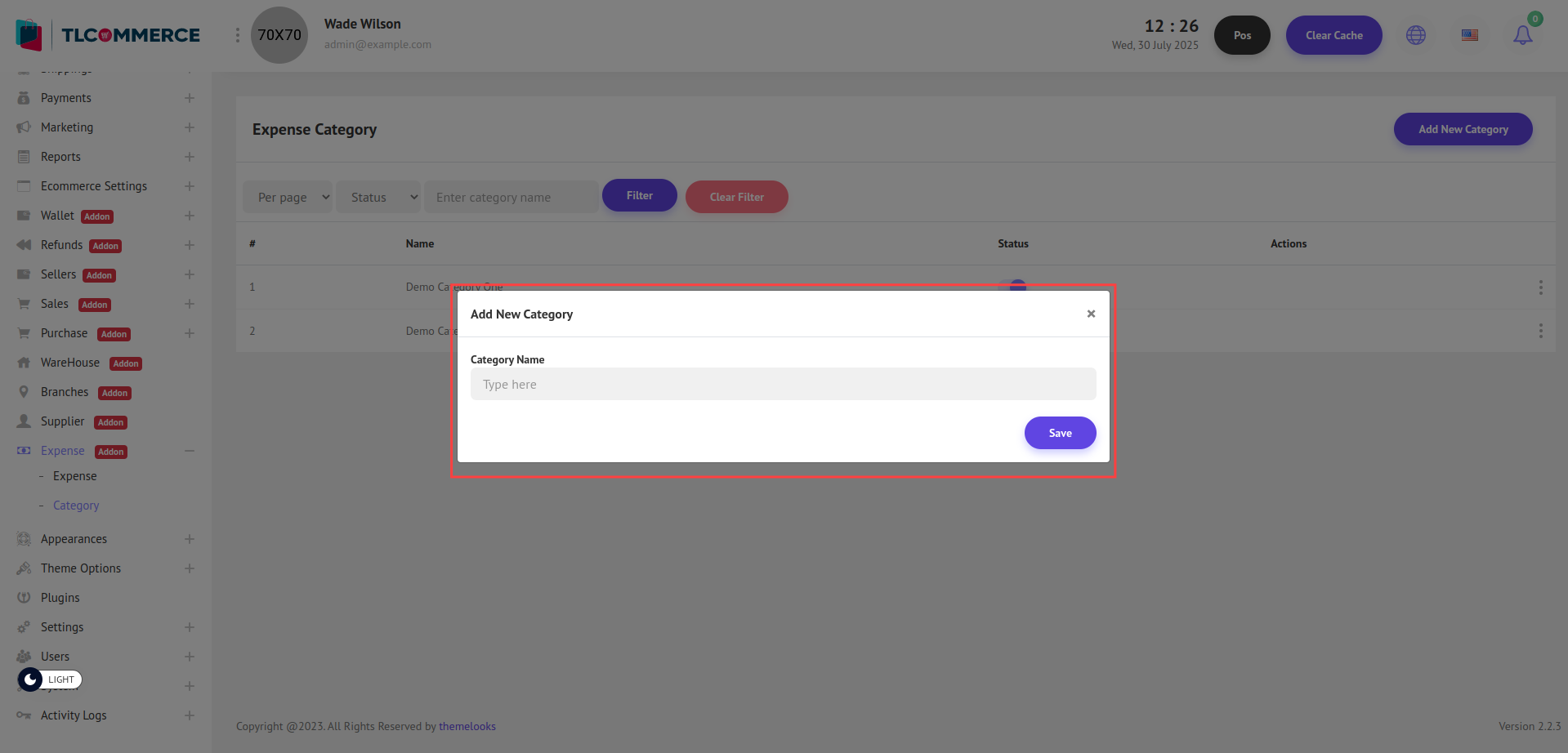 Once the POS Plugin is successfully installed, a new sidebar menu item called Expense will appear. To view expense categories, navigate to: Expense ->Category. Here, you can see the list of all existing expense categories.