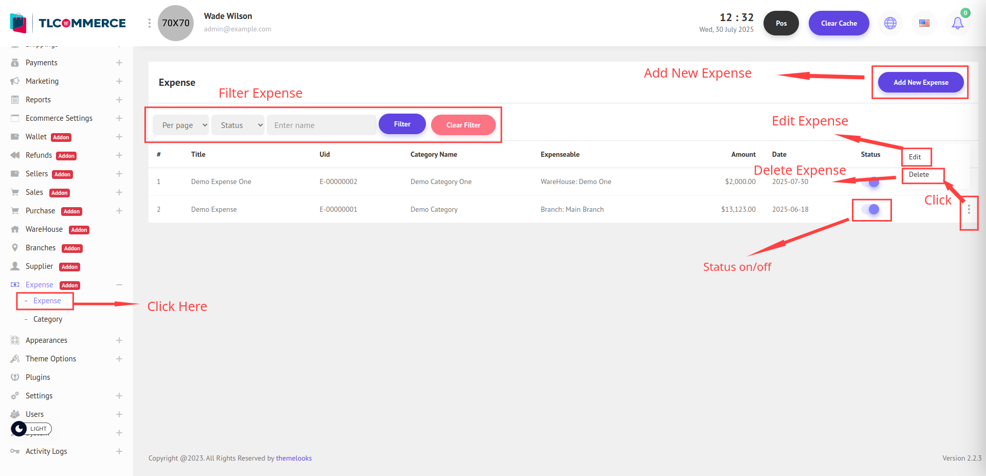 To edit an existing expense, simply click the Edit button from the list to open the pop-up modal and update the necessary information. And also can delete an expense by clicking the Delete link.