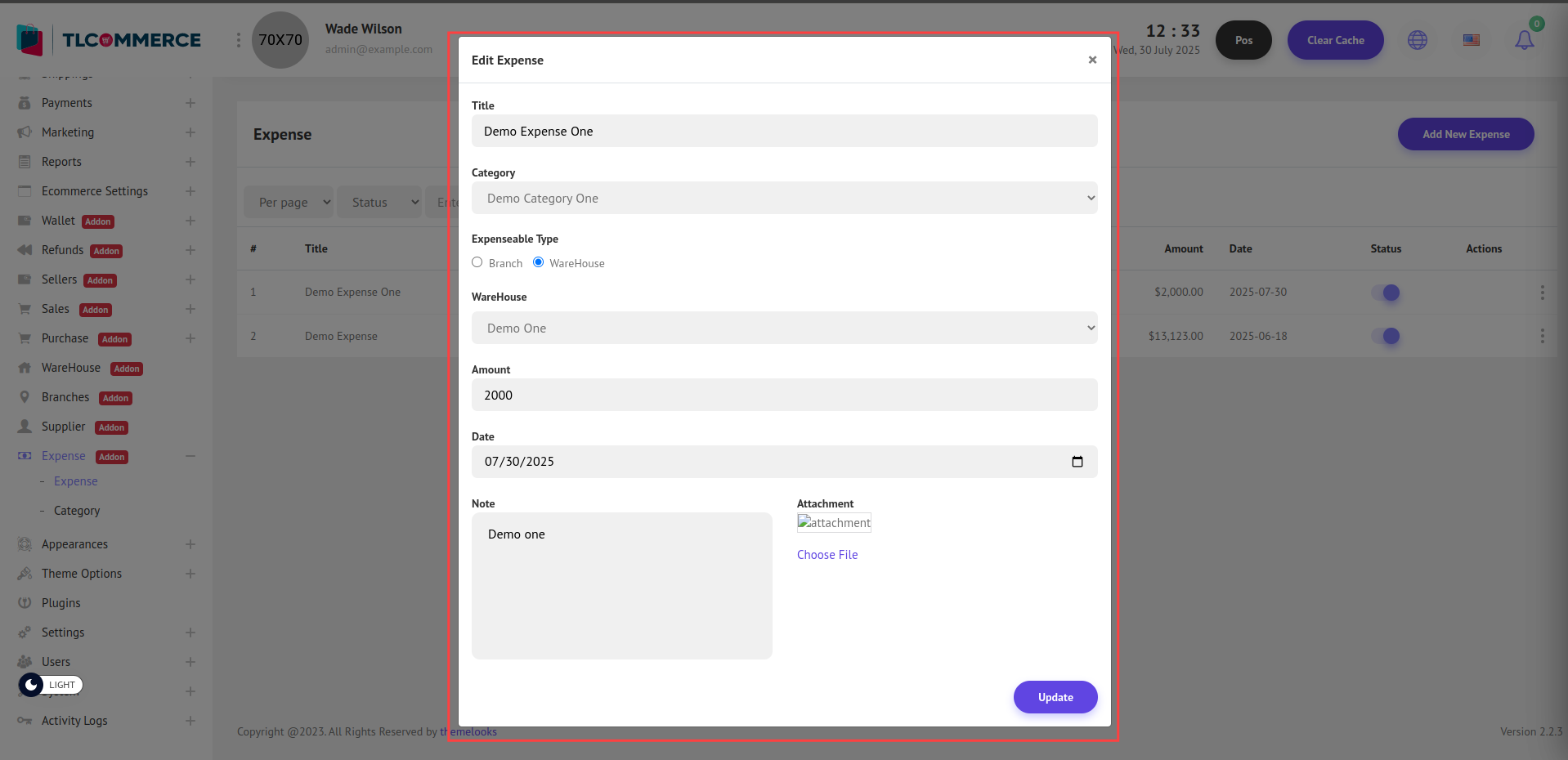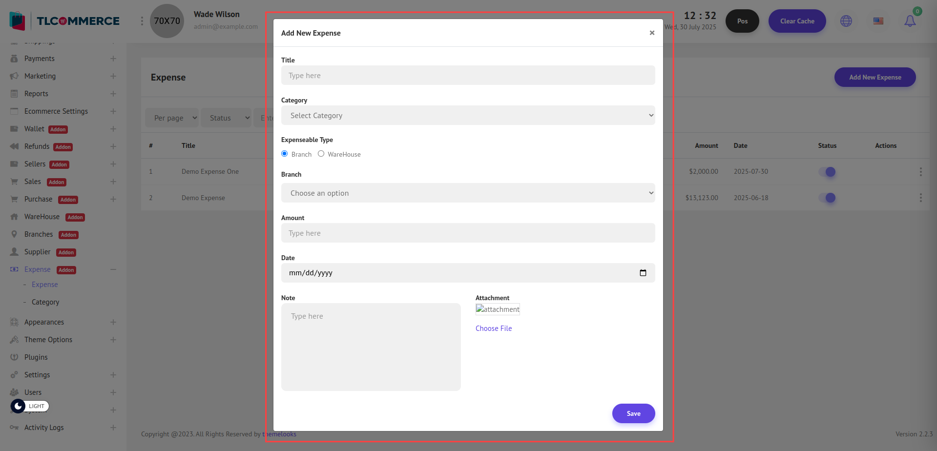 Also, you can create an expense by providing the necessary details. Enter the Title, Select Category, choose Expenseable Type, then open the Branch or Warehouse dropdown, Amount, Date, Note, and Attachment.