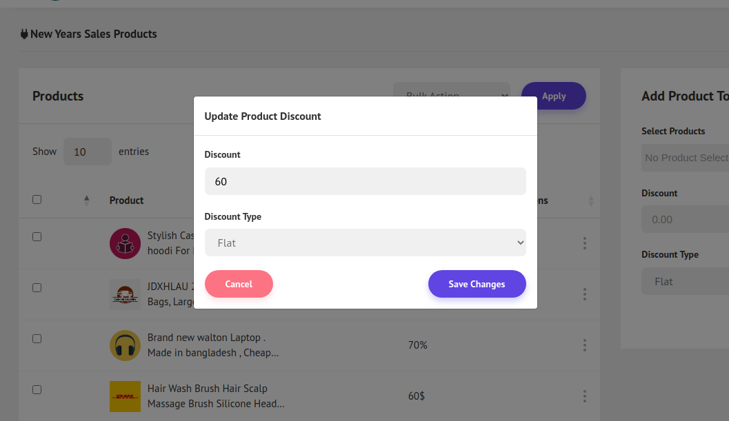 1. From the right side, you can select a single product or multiple products, then set the discount type and amount.