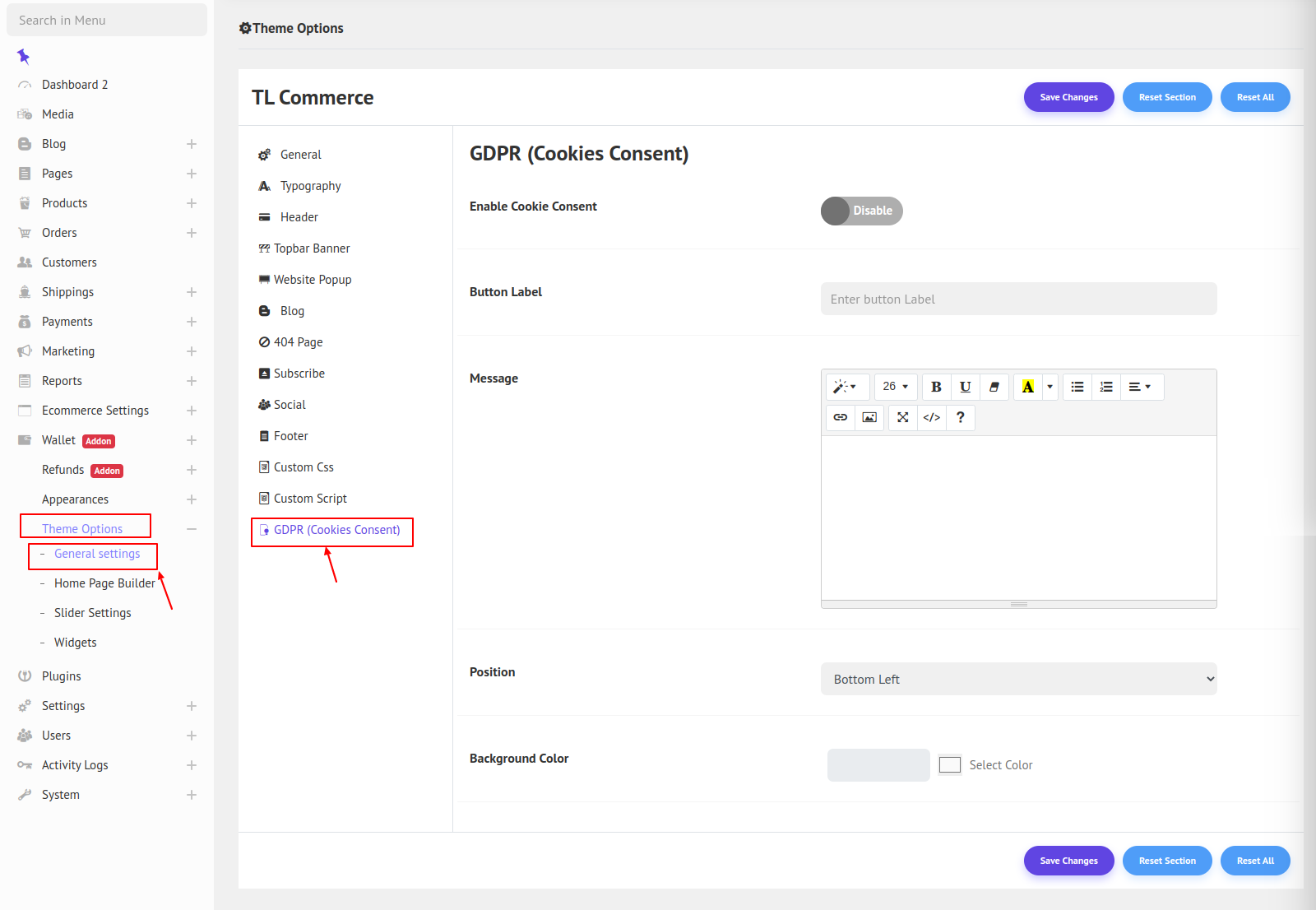 To manage GDRP Cookie Consent Follow Theme Options > General Settings. Click GDRP(Cookies Consent).
