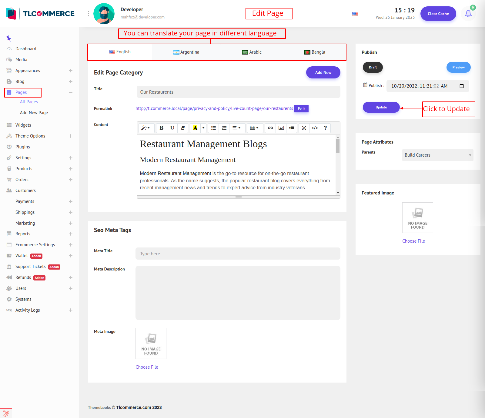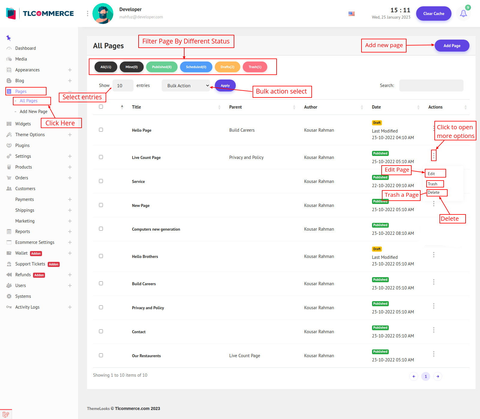 In this post, we will learn how to manage Pages. Follow Pages > All Pages and you will be redirected to the page list page. Here you can see all the pages and filter them by status, search page, and manage page, and also can create new pages.