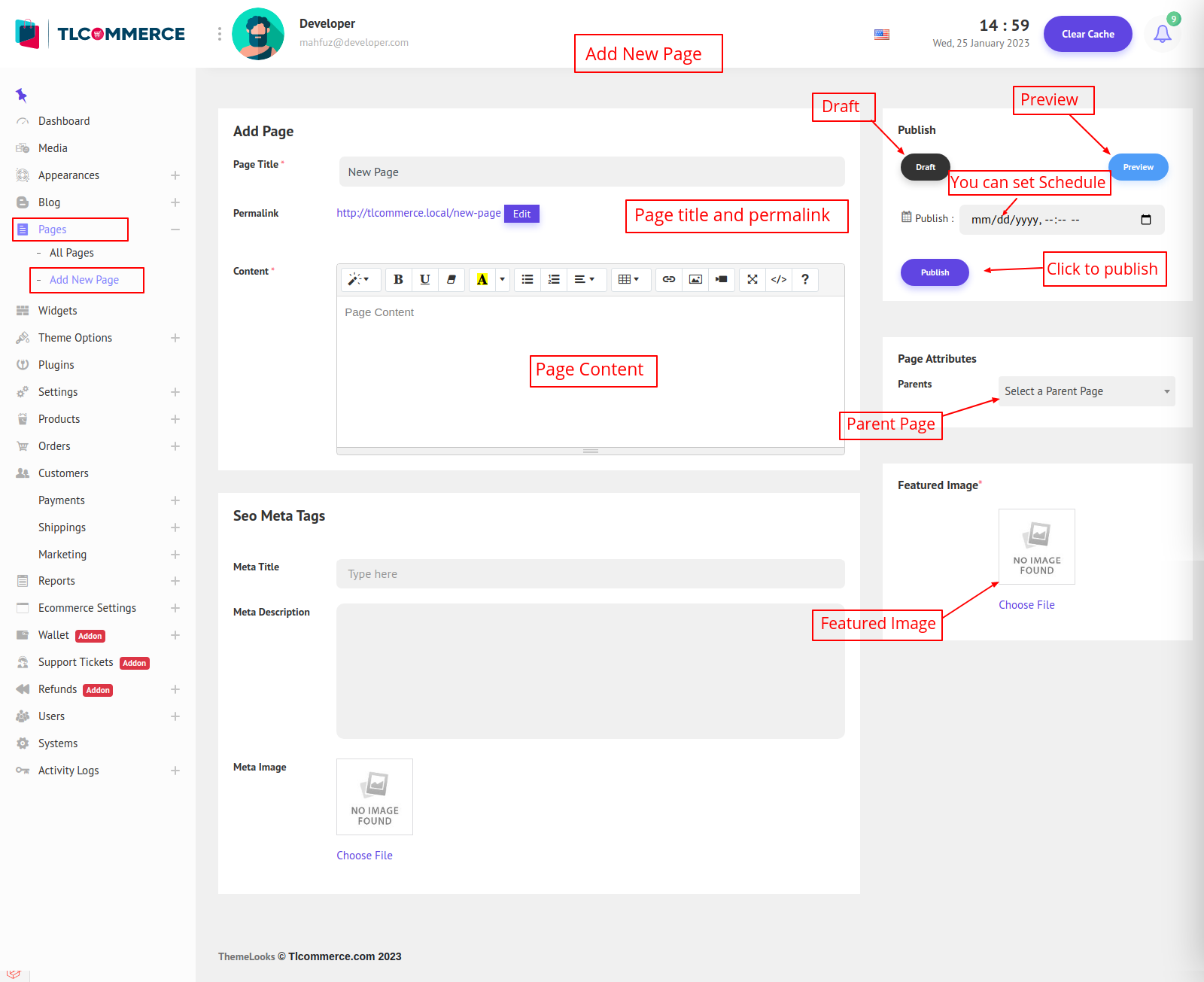 To create a new page click Add Page button or follow Pages > Add New Page and you will be redirected to add another page. Here you can create new pages, or make drafts to edit later and also can schedule a date to publish this blog.