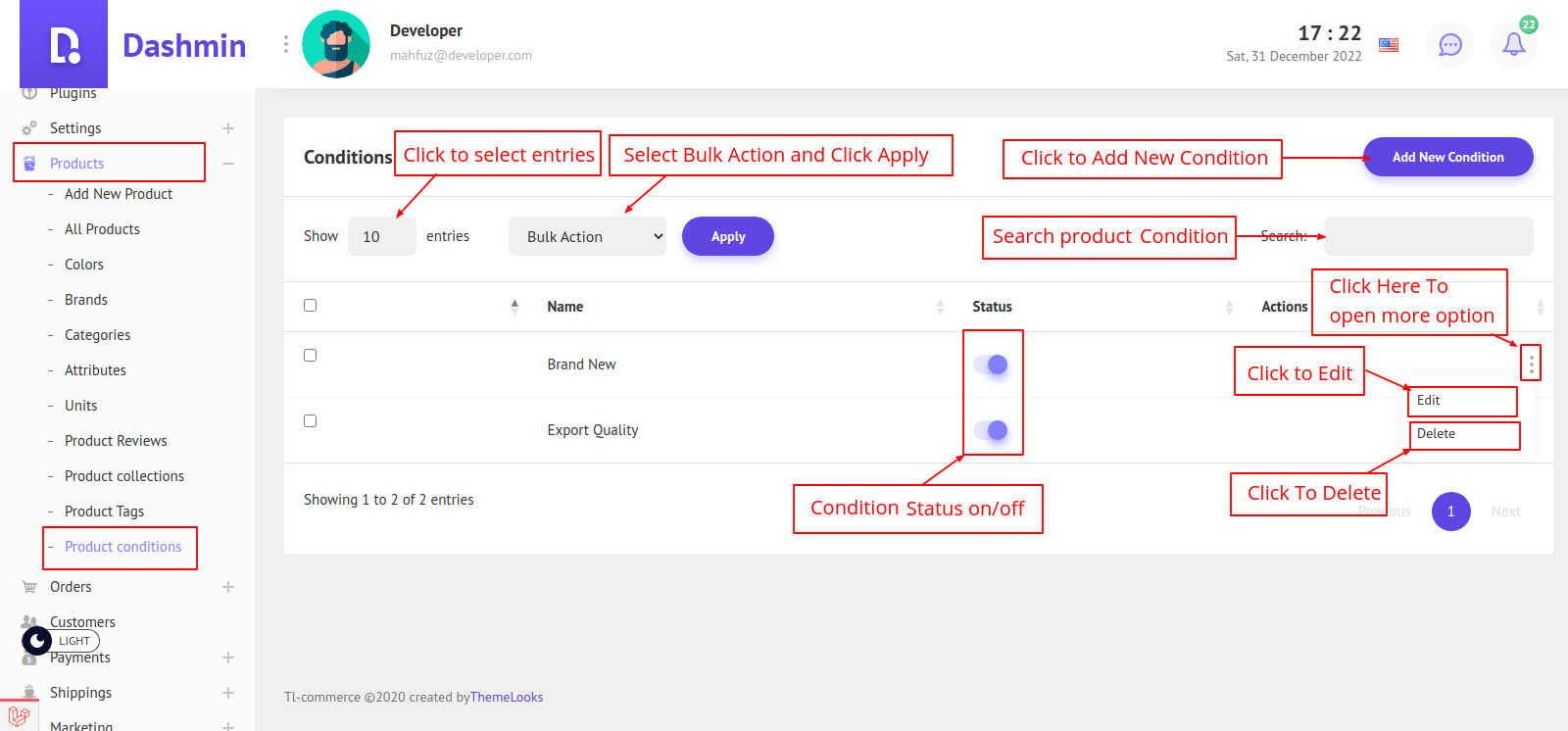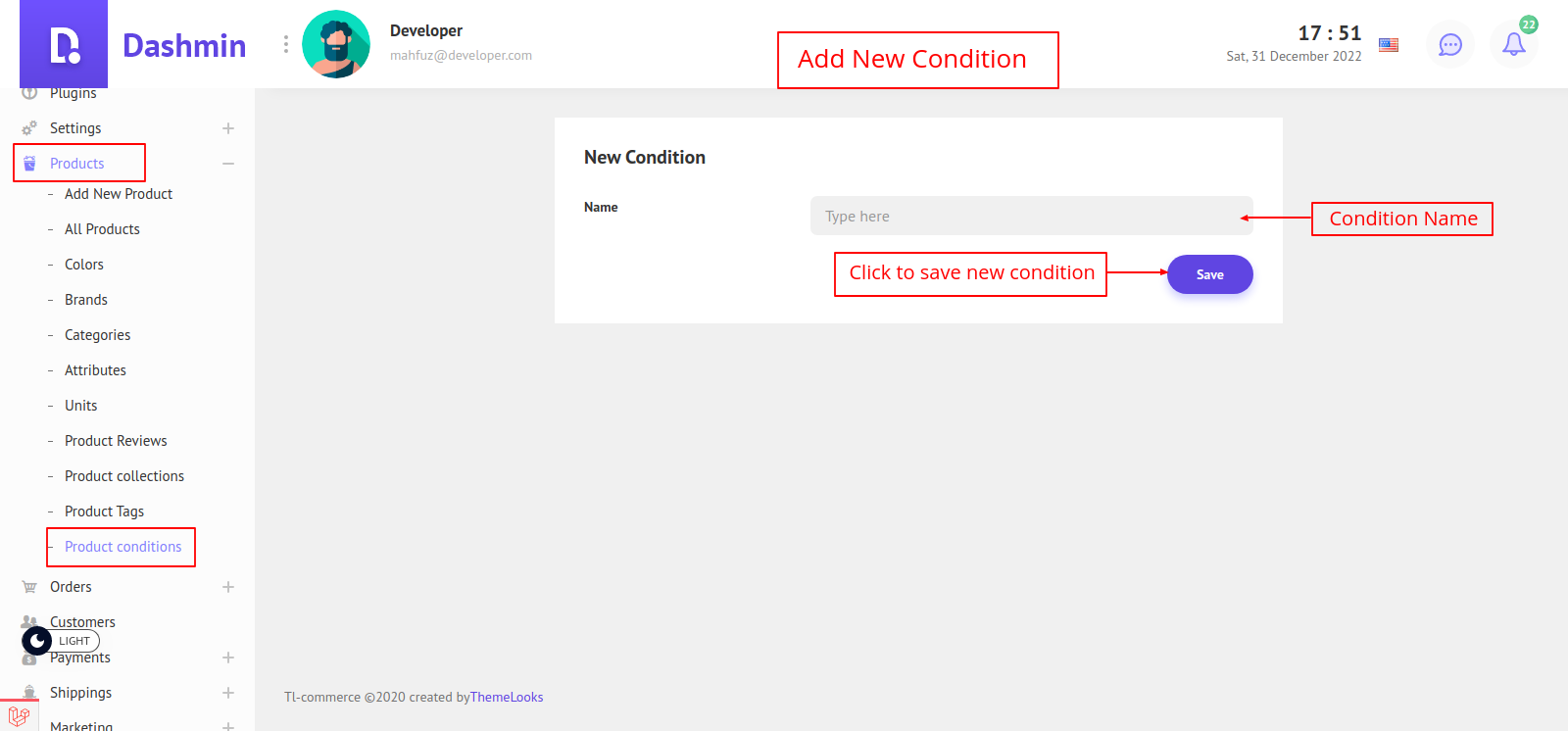 If you want to create a new condition click on Add New Condition on the top. It will redirect you to add new condition page.