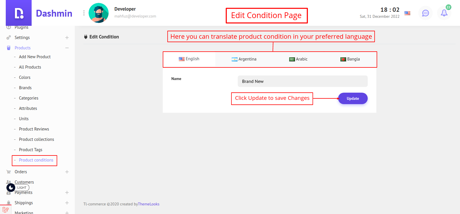 If you want to update a condition click Edit from condition list page and it will redirect you to edit page.