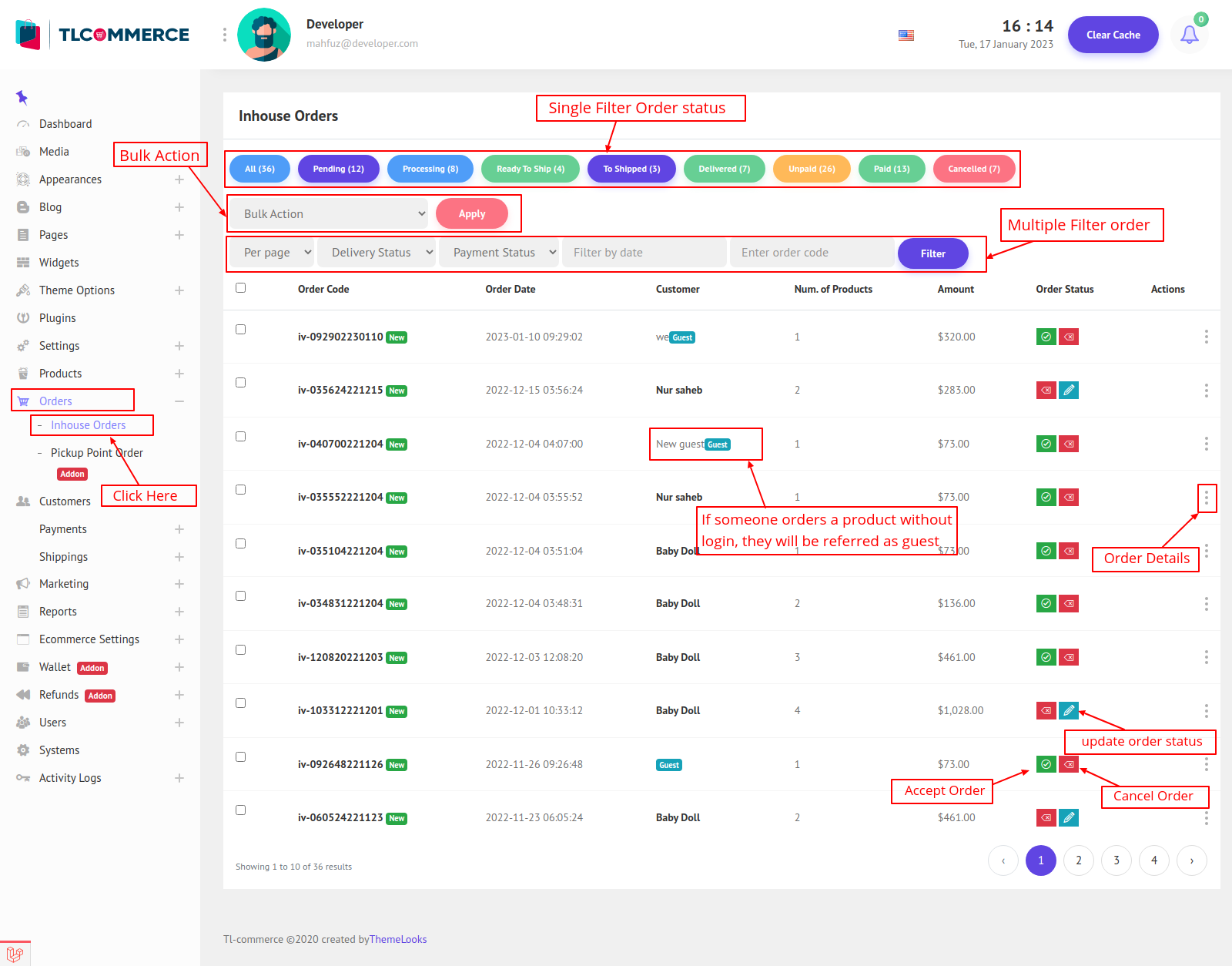 Follow Orders > Inhouse Order. You will be redirected to the Inhouse orders list page. In the Below Picture, you can find all the inhouse orders.