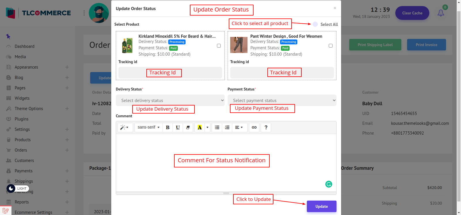 Here you can add the tracking id on each product. Also to update a product delivery and payment status just select that product and you can update the status. If you click select all then you can update the status for all products. You can add a comment for each update.