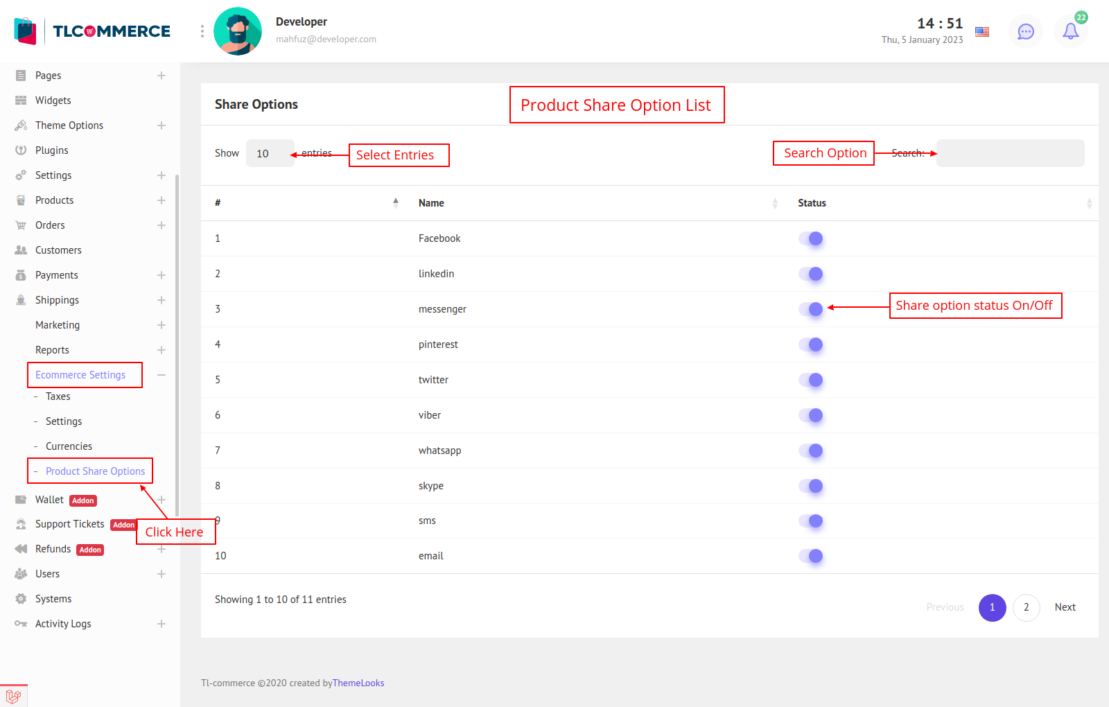 A Customer can share the product link in many media. Here on this page, all the options are available and you can select which options to show. You can turn off the status to hide any option. Go to E-commerce Settings > Product Share Options.