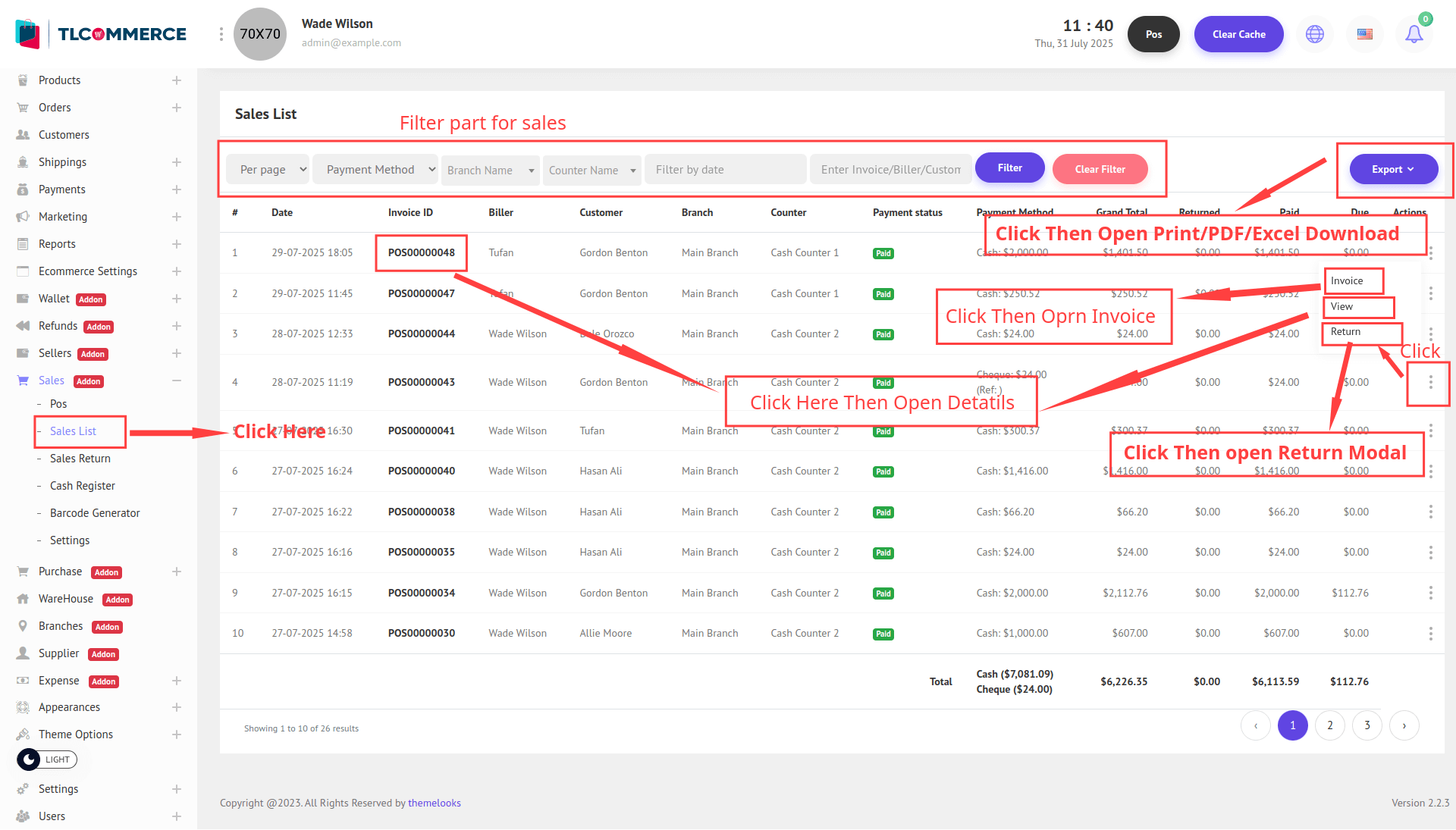 If you successfully install the POS Plugin, a new menu item called Sales -> Sales List will appear in the sidebar. Click it to view the list of sales.