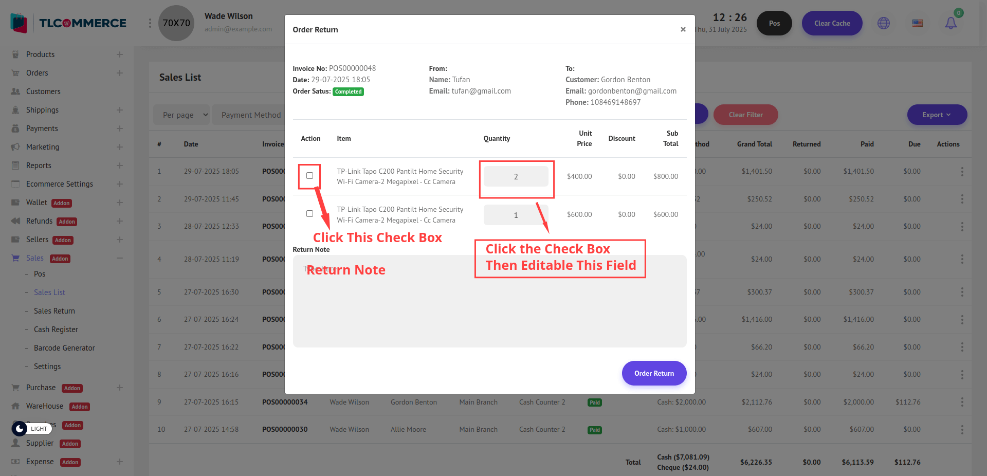 Return Note: You can write a reason or note for the return in the Return Note field.