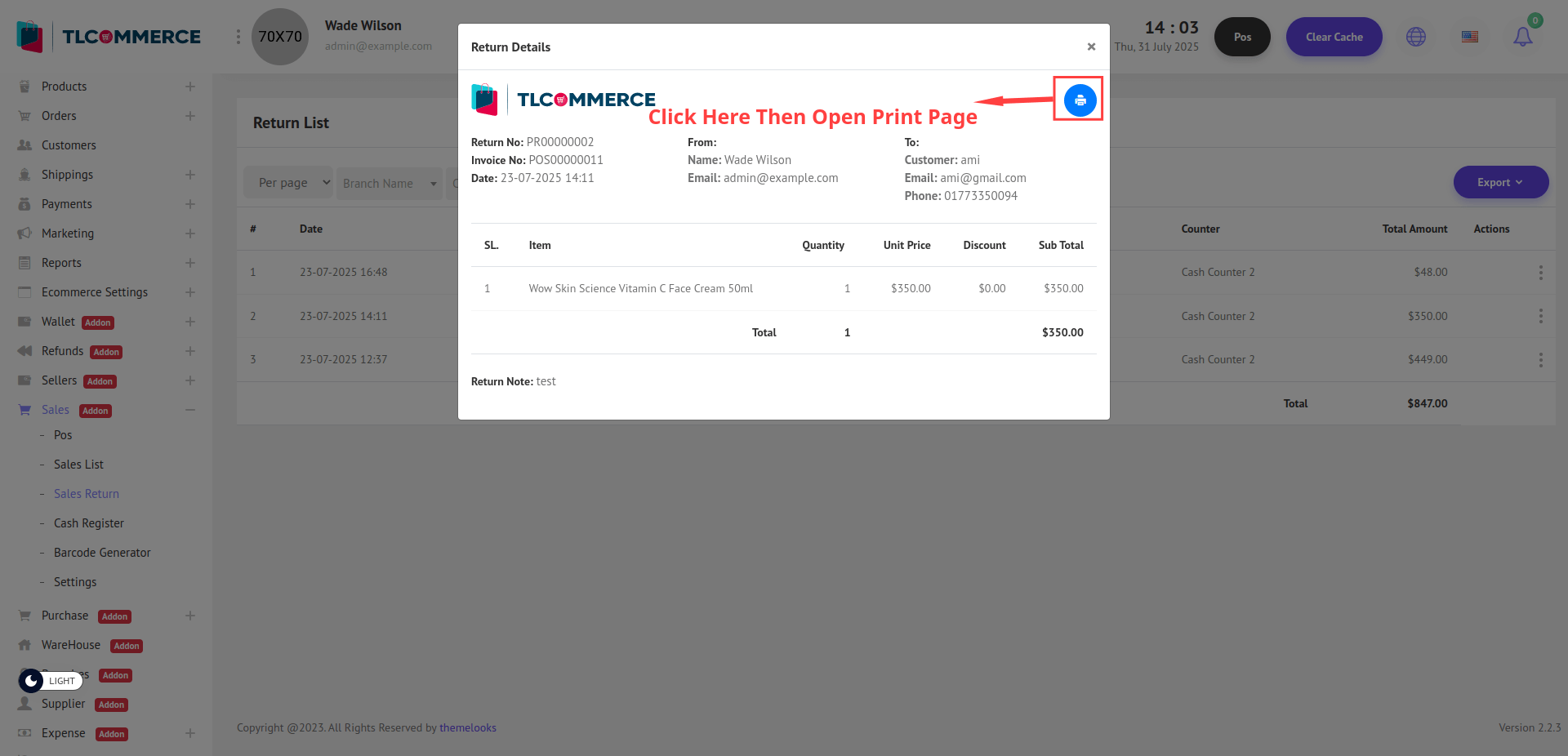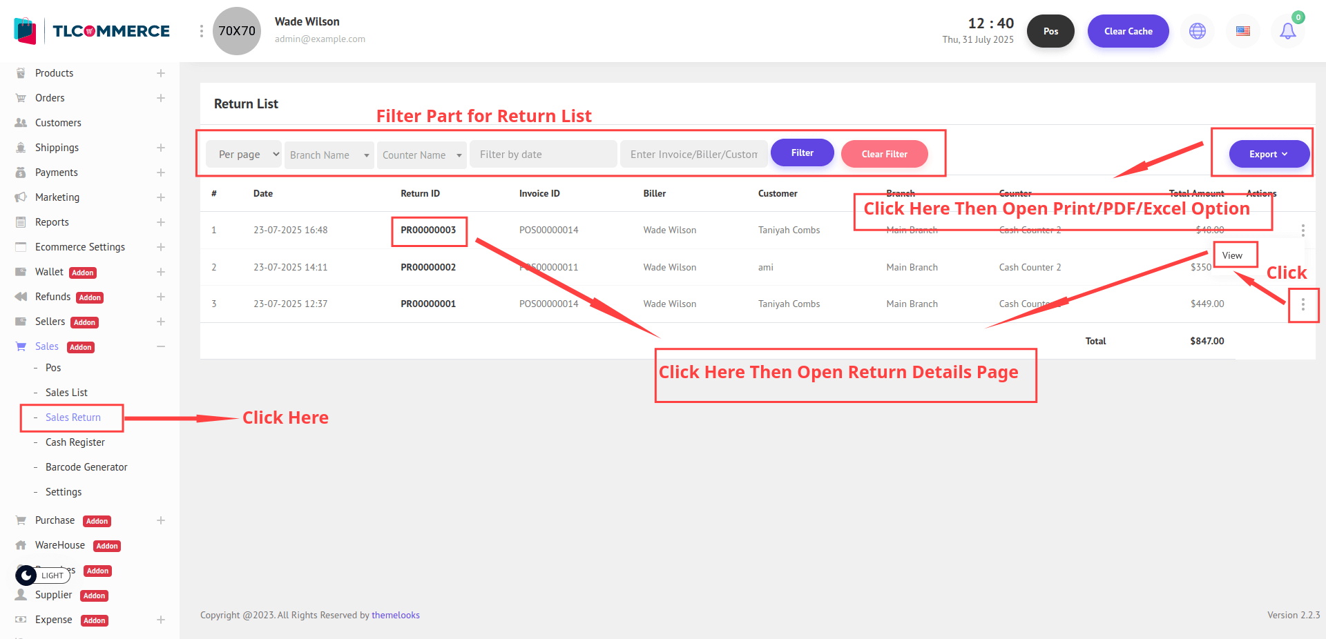 Now, you can click the Export button to open a dropdown menu with options like Print, PDF, and Excel. Select any of these to download the sales return in your preferred format.