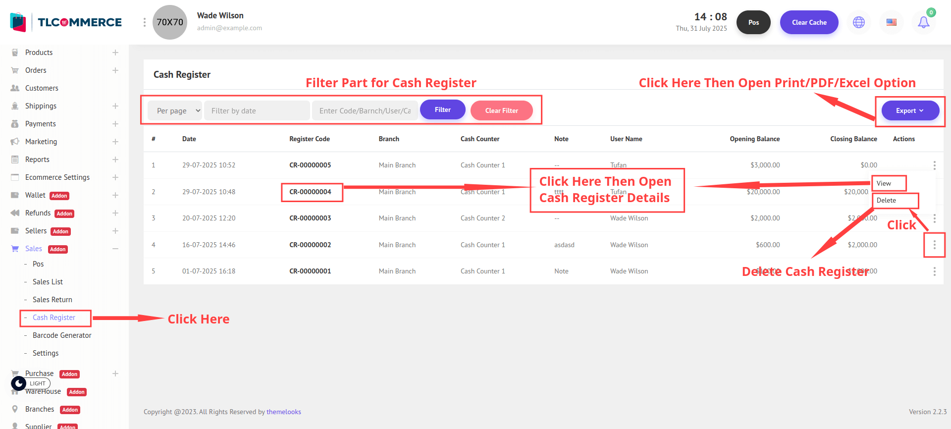 Now, you can click the Export button to open a dropdown menu with options like Print, PDF, and Excel. Select any of these to download the cash register in your preferred format.