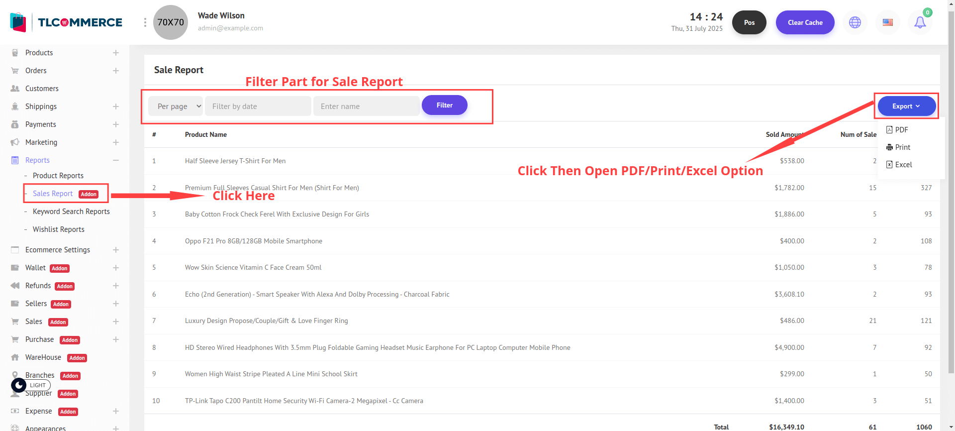 Now, you can click the Export button to open a dropdown menu with options like Print, PDF, and Excel. Select any of these to download the sales list in your preferred format.