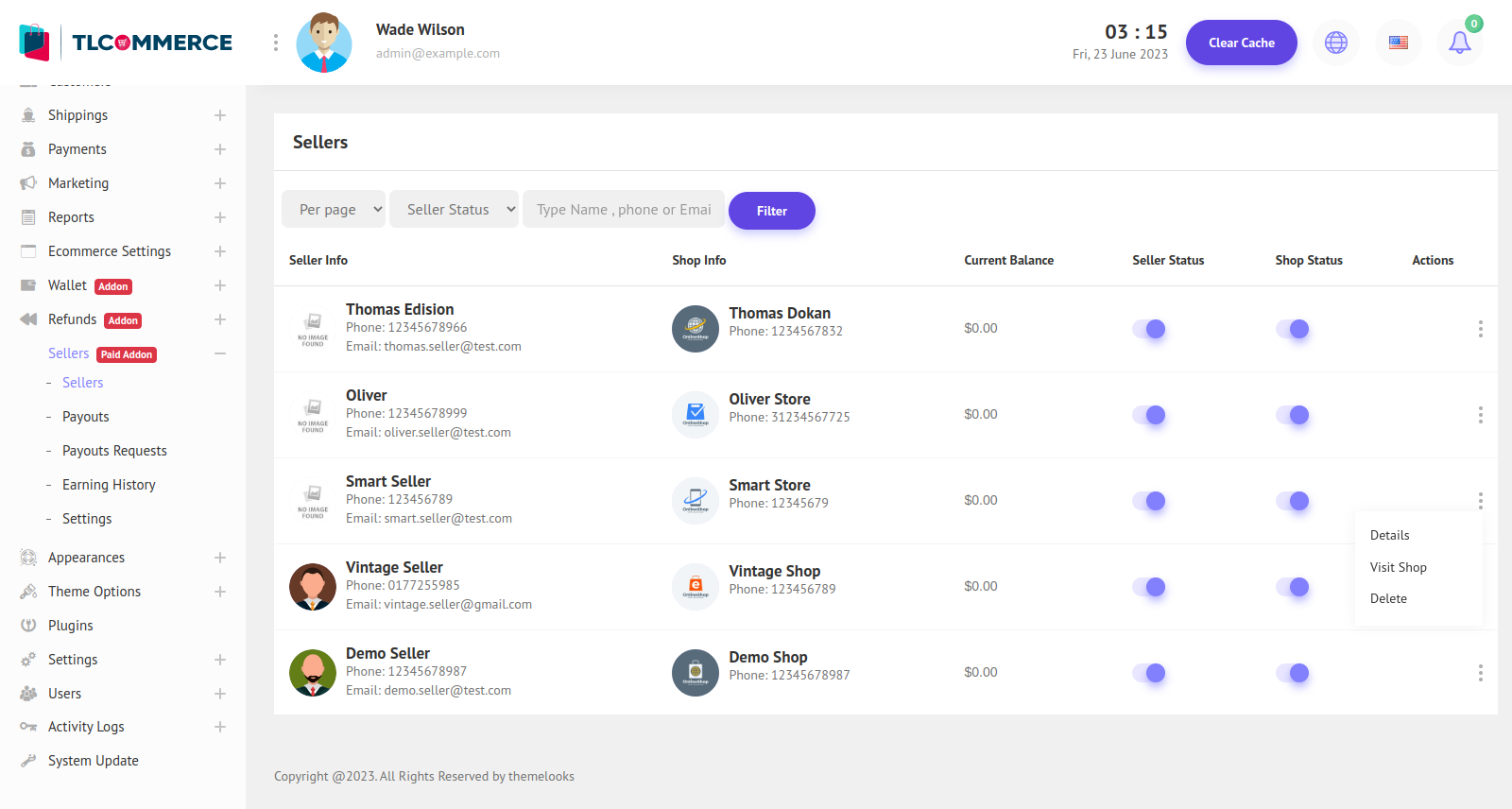 You can filter the list, and delete the seller. Turn on/off Seller and their Shop Status. You Click the Details Link, to visit seller Details information.