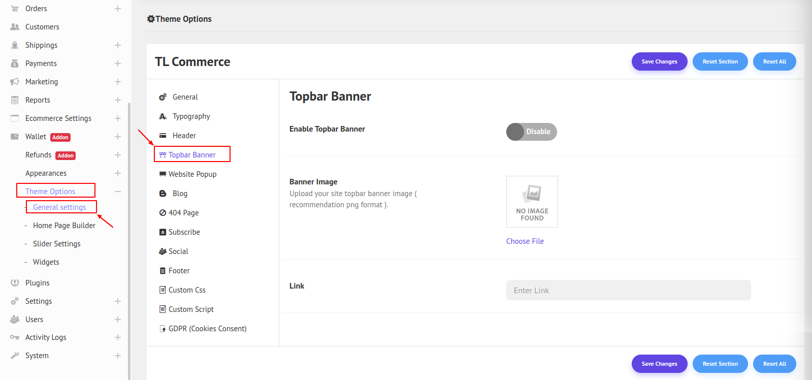 Enable Topbar Banner - Here you can show or hide the topbar banner from the site header.