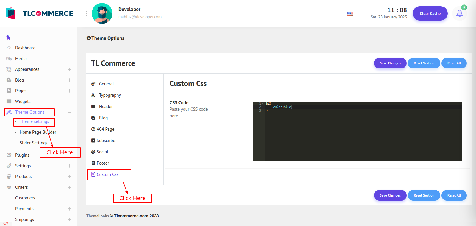 Click Save Changes to save theme options. Click Reset Section to reset only this section. Click Reset All to reset all theme options.