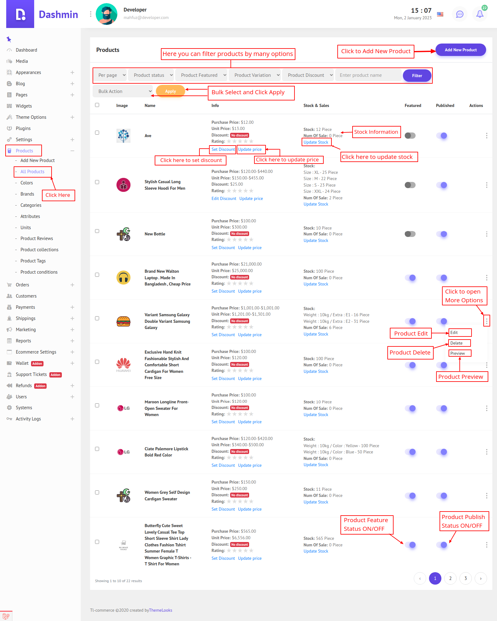 To see the Product List. Click Products > All Products. You will be redirected to product list page. In the below picture there is a brief explanation about the product list.