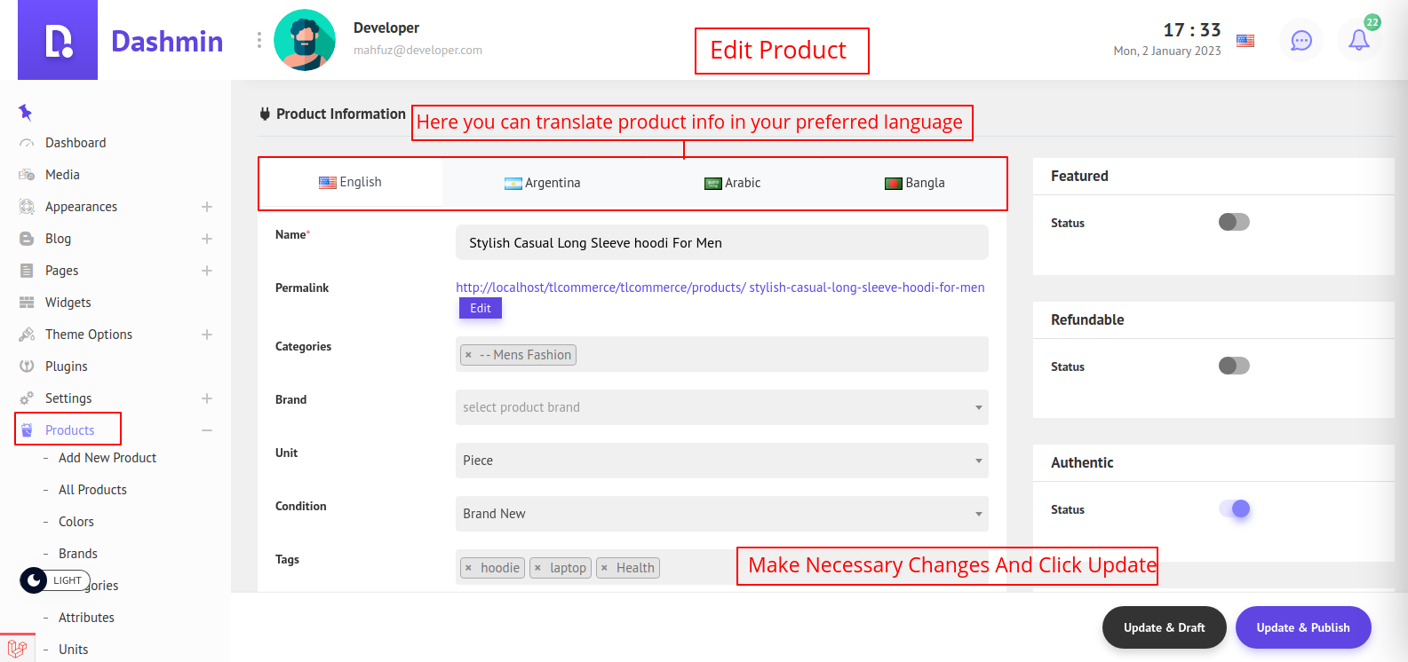 To Edit a product click Edit from product list.It will redirect you to the edit page.