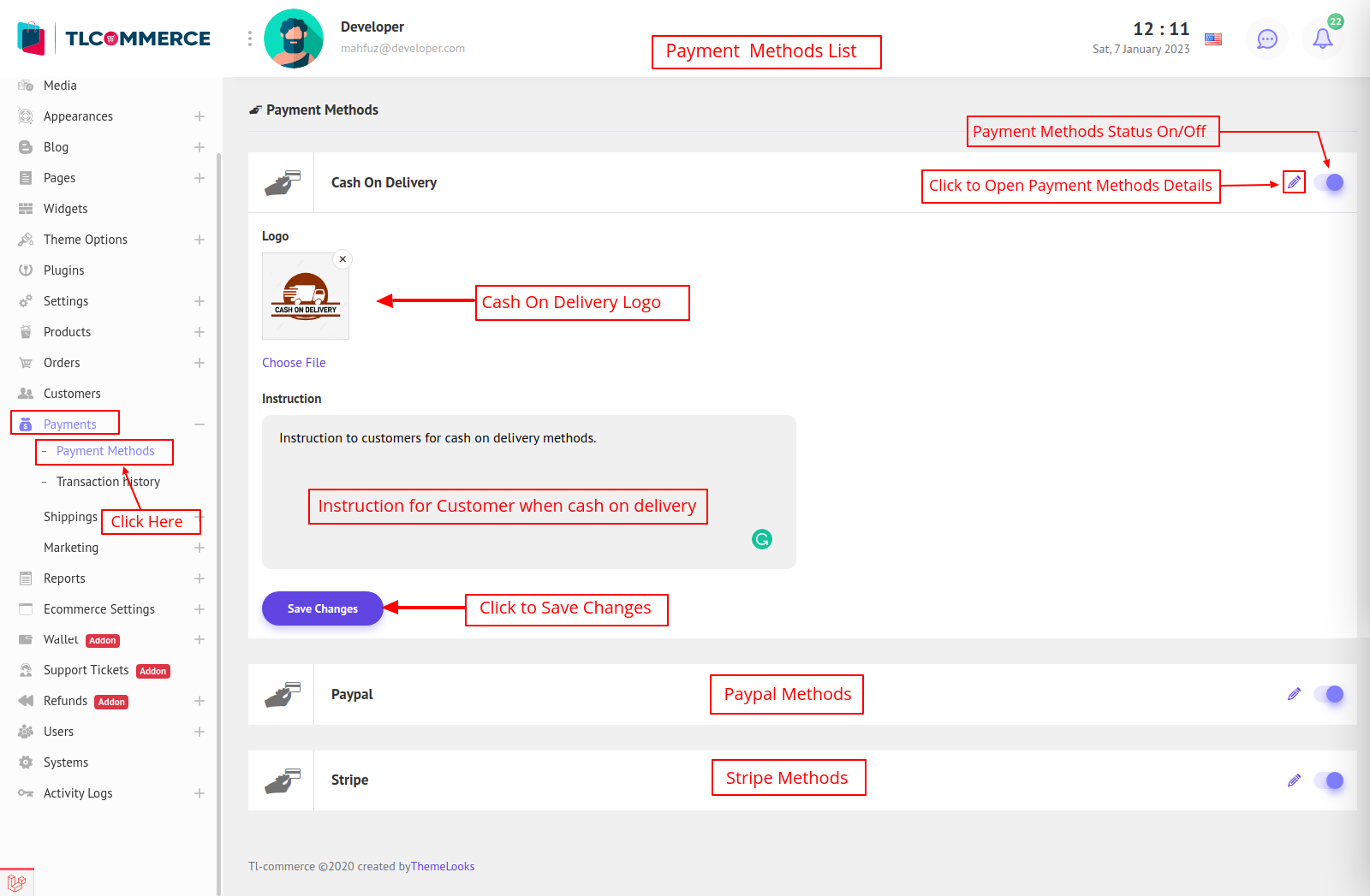 In the upper image, you can see we configure cash on delivery and save it. You can On/Off method status.
