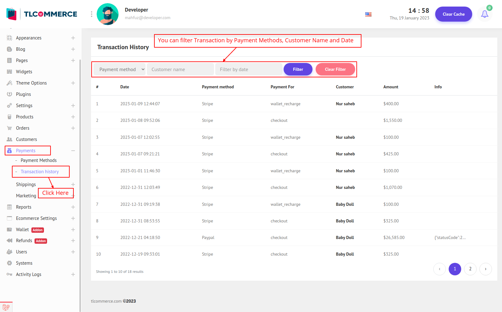 Now to view all the payment transaction history follow Payments > Transaction History. You will be redirected to the transaction list page. You can filter them by transaction payment method, customer name, and by date.