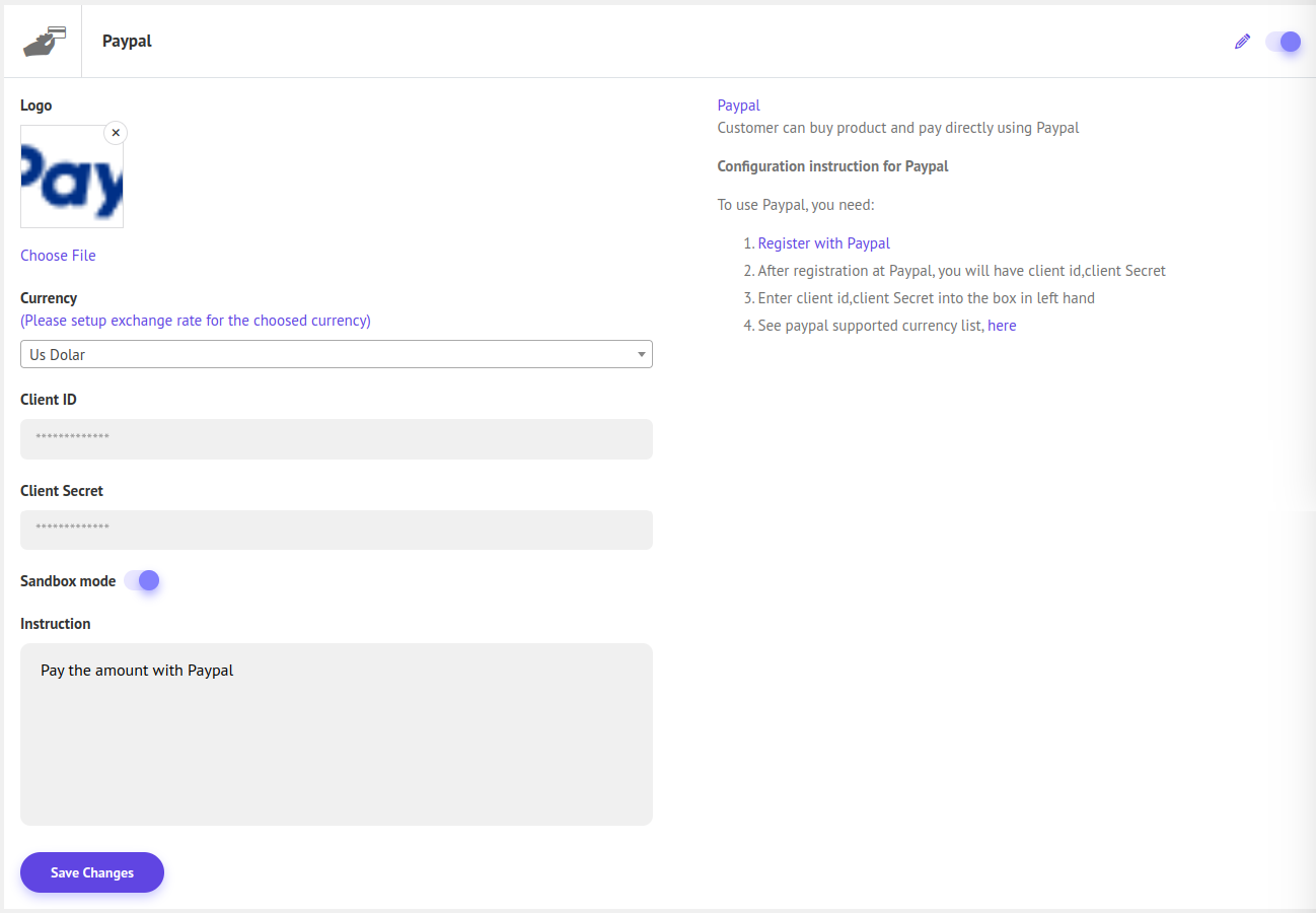 For Paypal client id and client secret follow the link https://www.paypal.com/bd/home and register. After registering, you will be given the client id and client secret. Now fill in the field and click save changes. And there is also a sandbox switch for check purposes, you can switch it off for live payment.