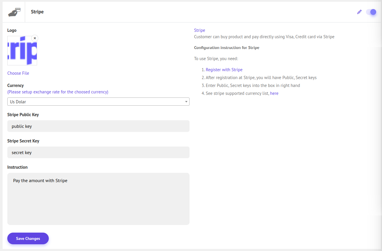 For Stripe public key and public secret key follow the link https://stripe.com/ and register. After registering, you will be given the public key and public secret key. Now fill in the field and click save changes.