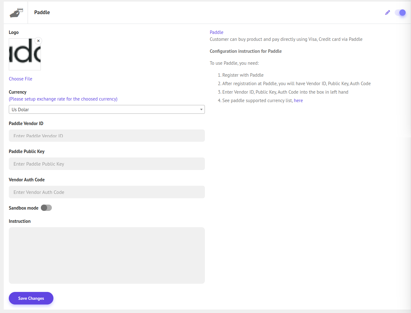 For Paddle vendor id, public key, and auth key follow the link https://www.paddle.com/ and register. After registering, you will be given the vendor id, public key, and auth key. Now fill in the field and click save changes. And there is also a sandbox switch for check purposes, you can switch it off for live payment.