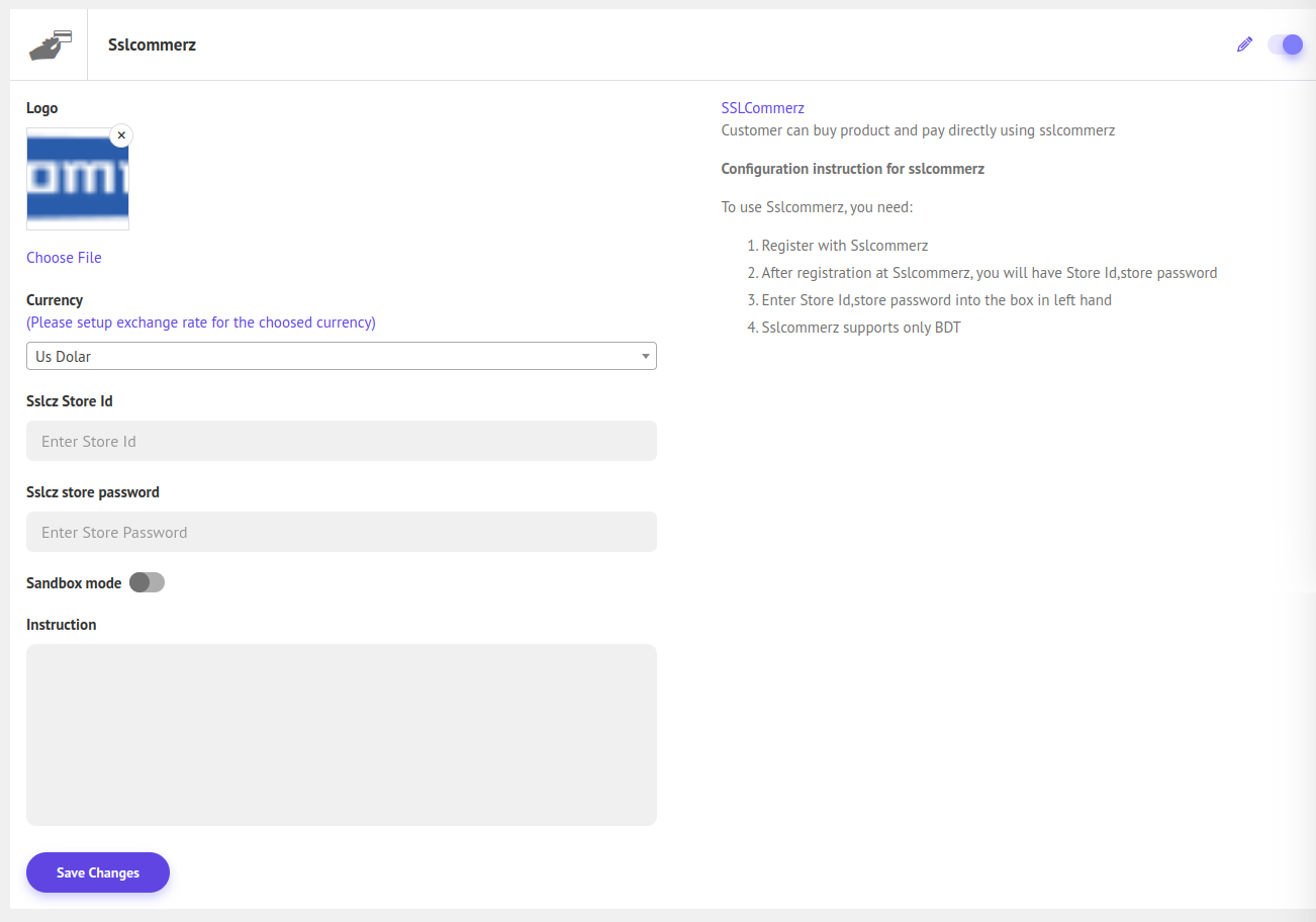 For the Sslcommerze store id and store password follow the link https://sslcommerz.com/ and register. After registering, you will be given the store id and store password. Now fill in the field and click save changes. And there is also a sandbox switch for check purposes, you can switch it off for live payment.