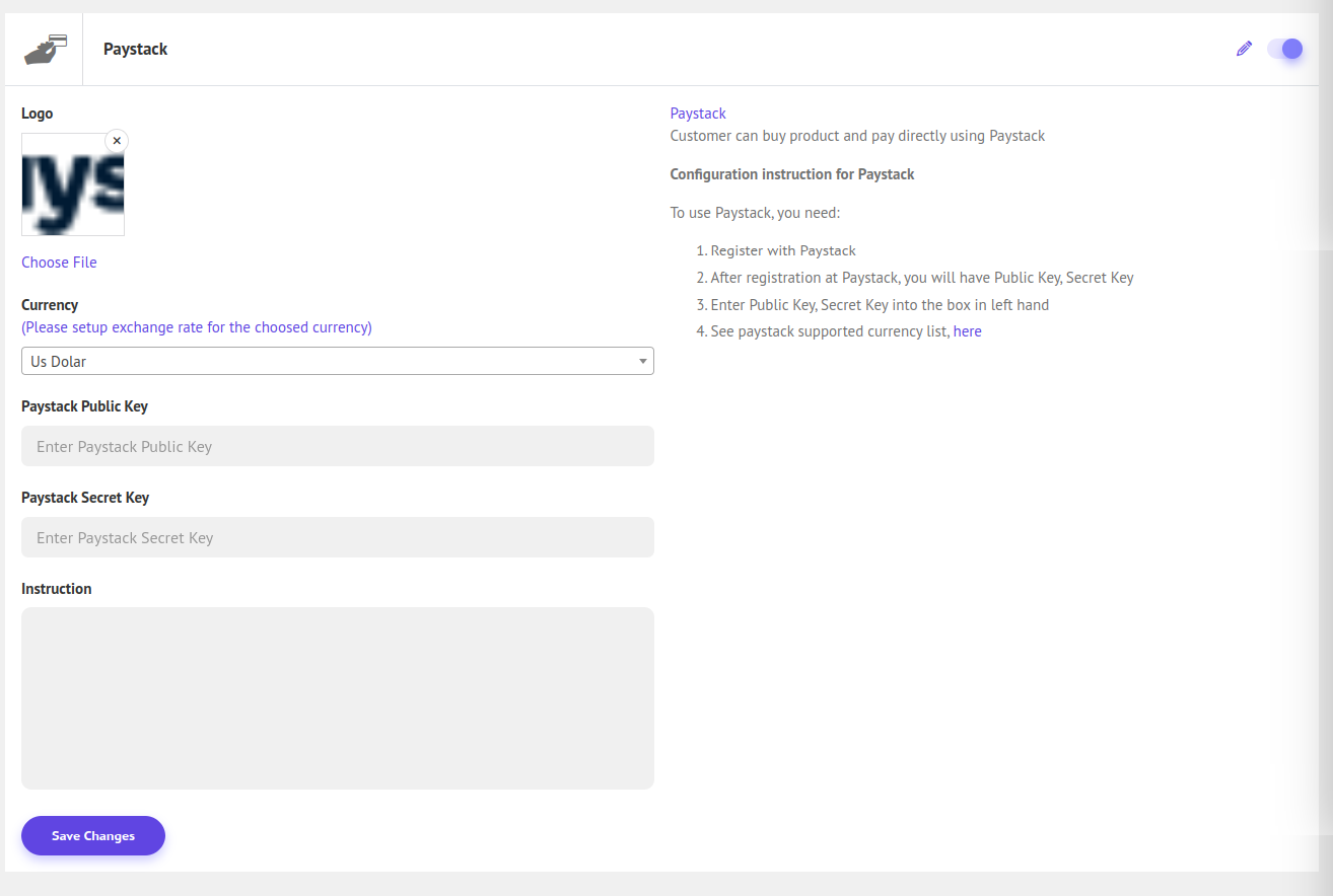 For the Paystack public key and secret key follow the link https://paystack.com/ and register. After registering, you will be given the public key and secret key. Now fill in the field and click save changes.