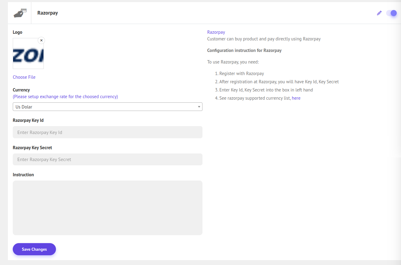For the Razorpay key id and key secret follow the link https://razorpay.com/ and register. After registering, you will be given the key id and key secret. Now fill in the field and click save changes..