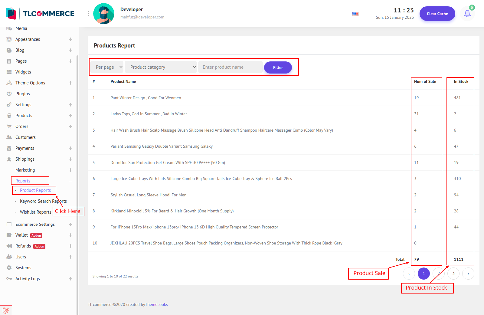 Follow Reports > Product Reports. Here in this list, you can see product sales and in stock reports. You can filter reports by product category, search product name, and per-page report number.
