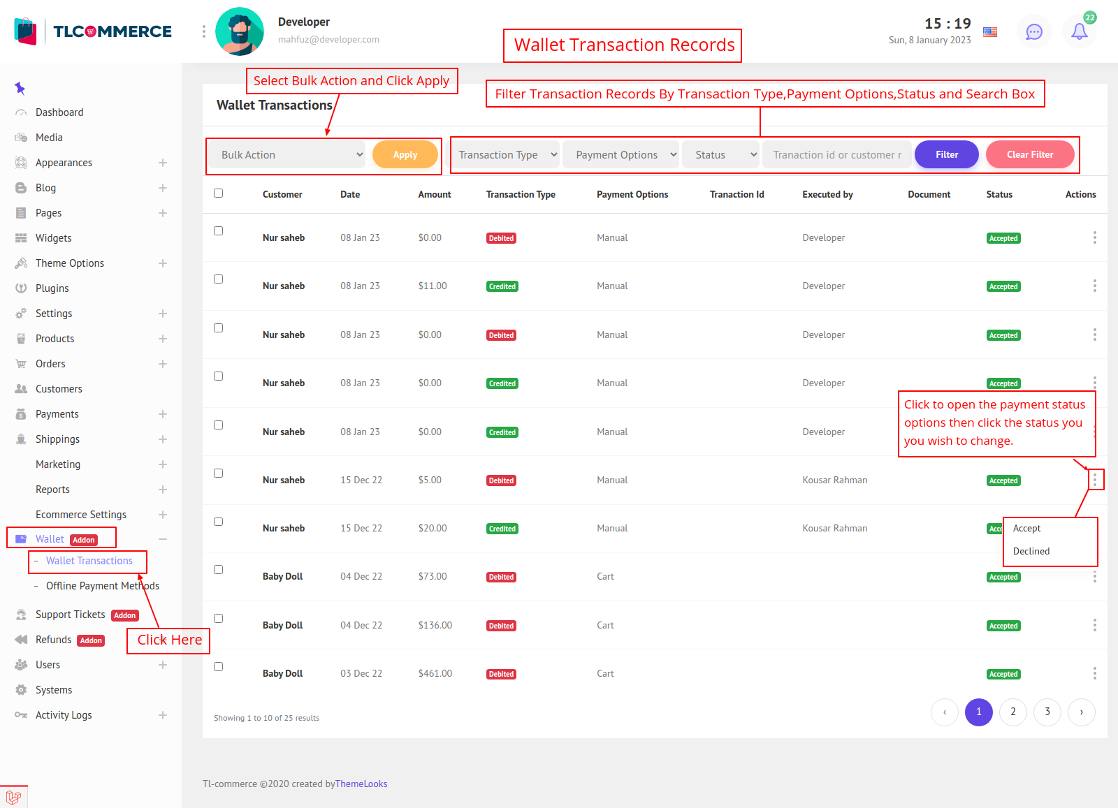 You can filter transaction records by payment transaction options, transaction types, transaction status, and by searching. Also Can change transaction status.