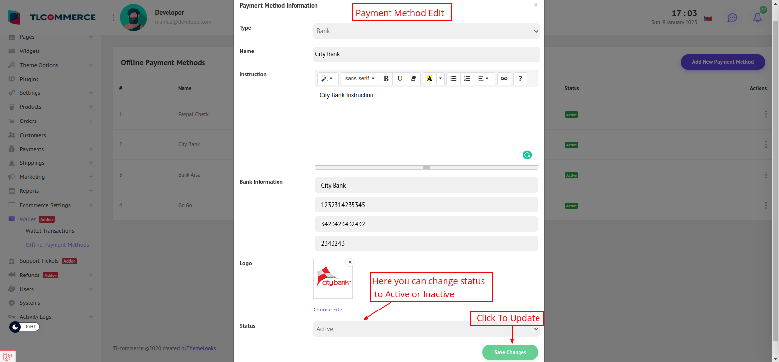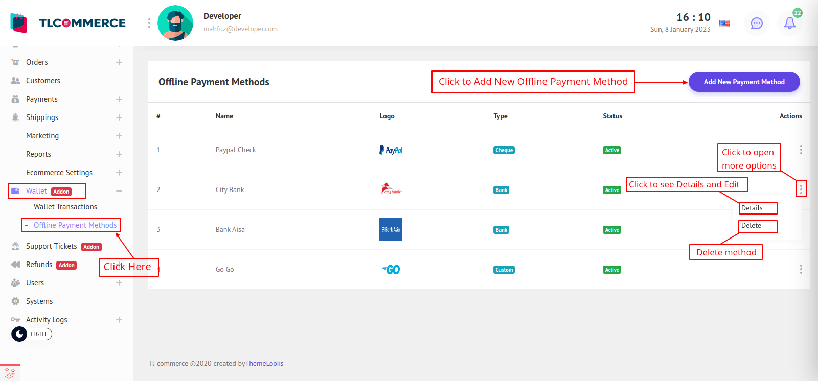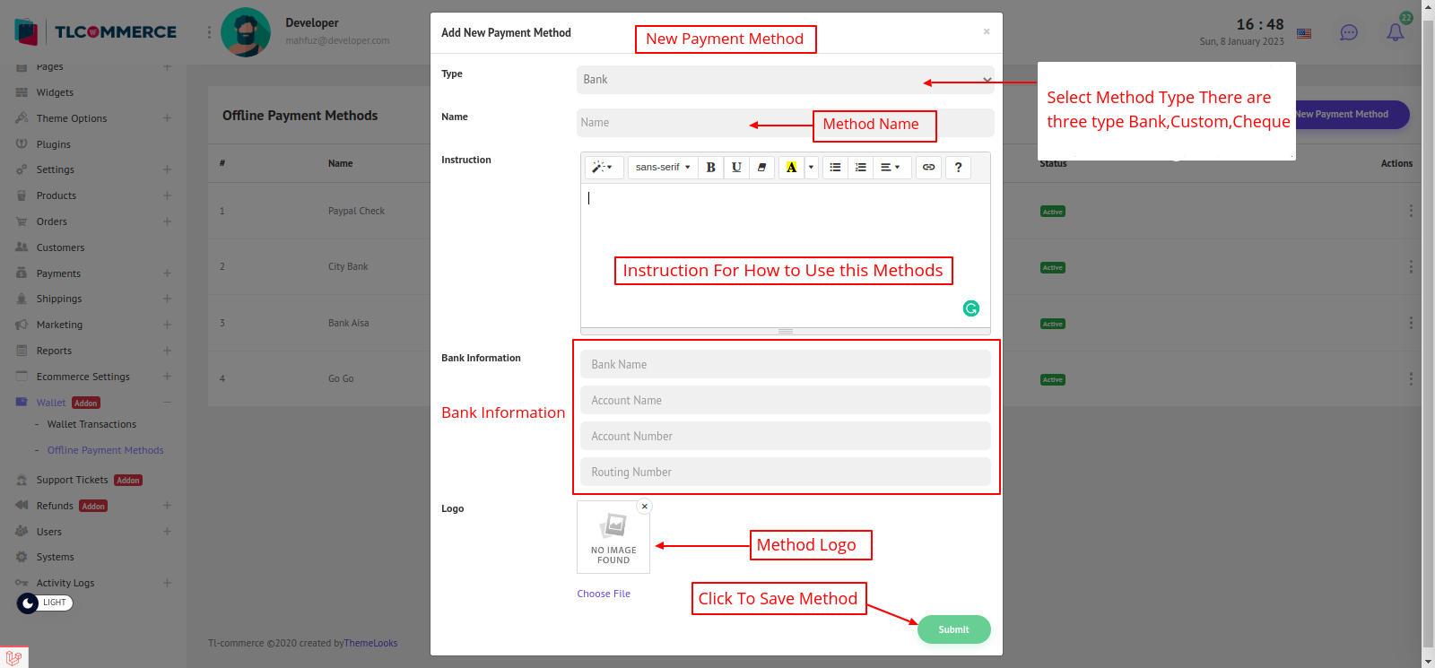 With Wallet Plugin active, you can add Offline Payment methods. Offline Payment methods are used so that customers can add amounts to their wallets other than online payment methods.