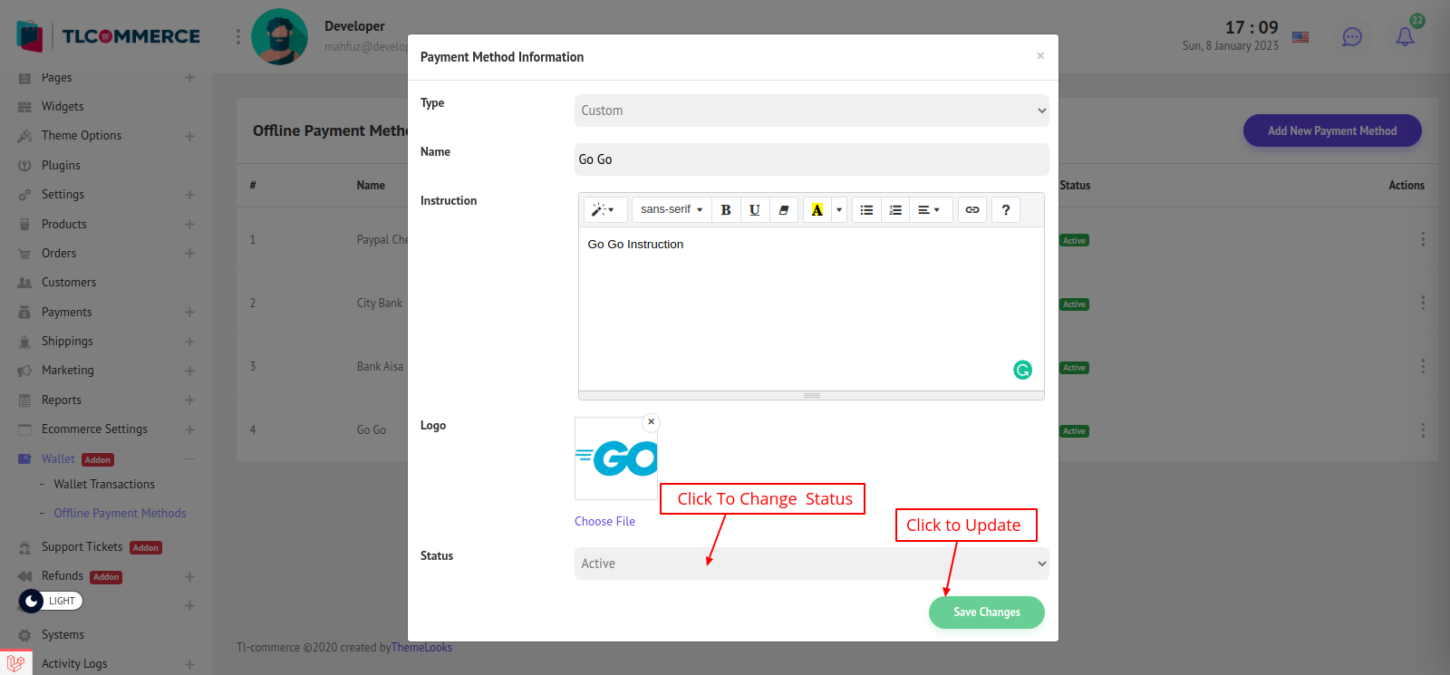 If the method was custom or cheque type the model will look like this. You can make changes and set status. Then click Save Changes to update the method.